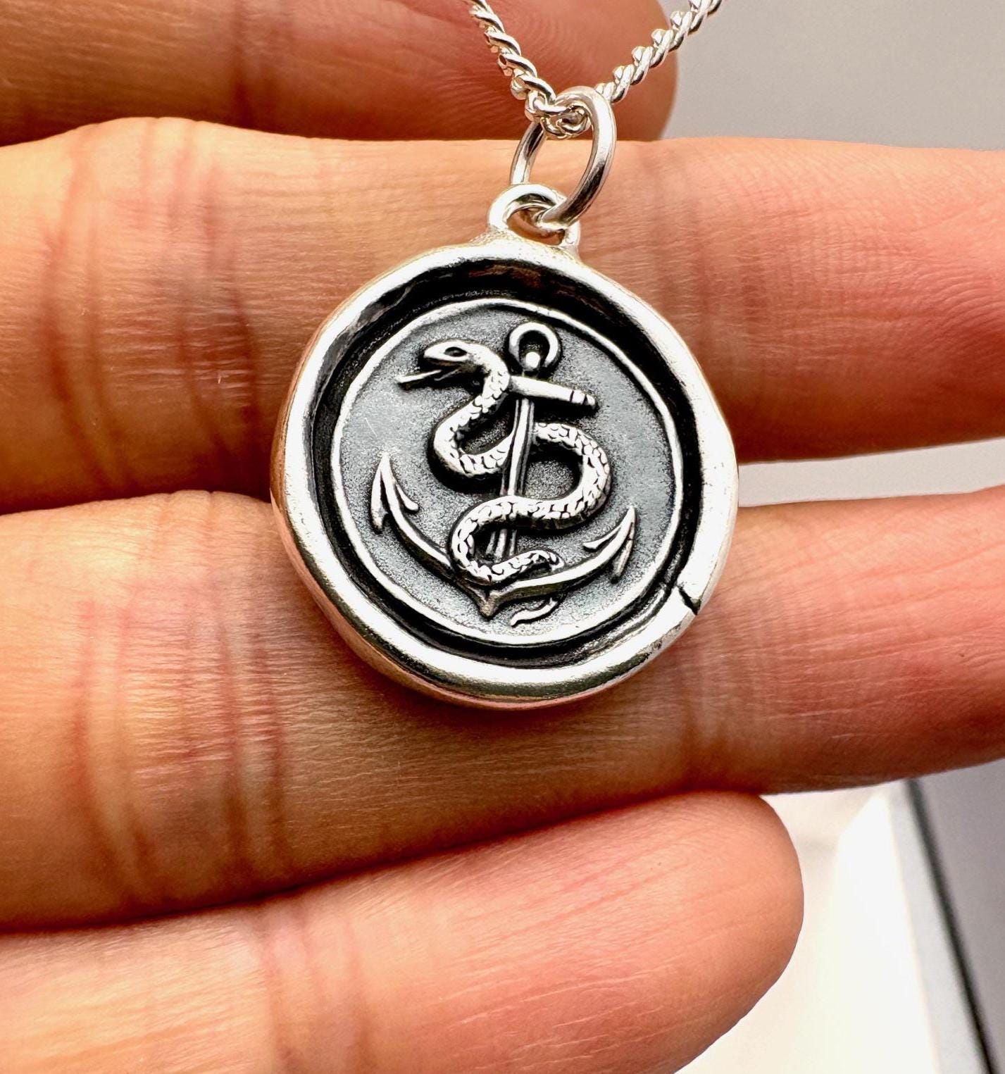 Solid Silver Anchor & Serpent Necklace • Wax Seal Pendant of Strength & Wisdom • Handmade Nautical Jewelry by Liliane Ting