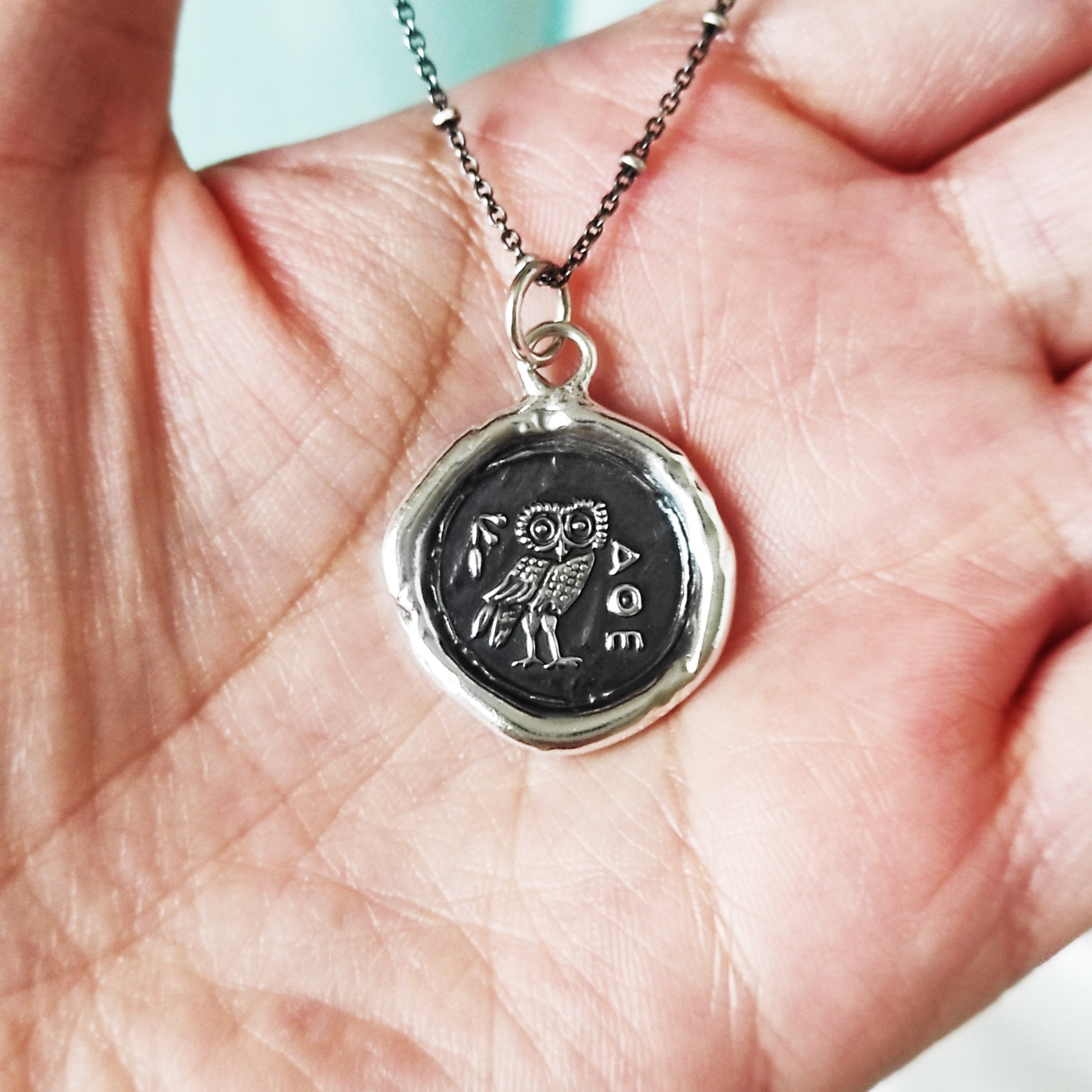 Athena Owl Wax Seal Necklace – Handmade Silver Intaglio Amulet Pendant, Heirloom Design LT048