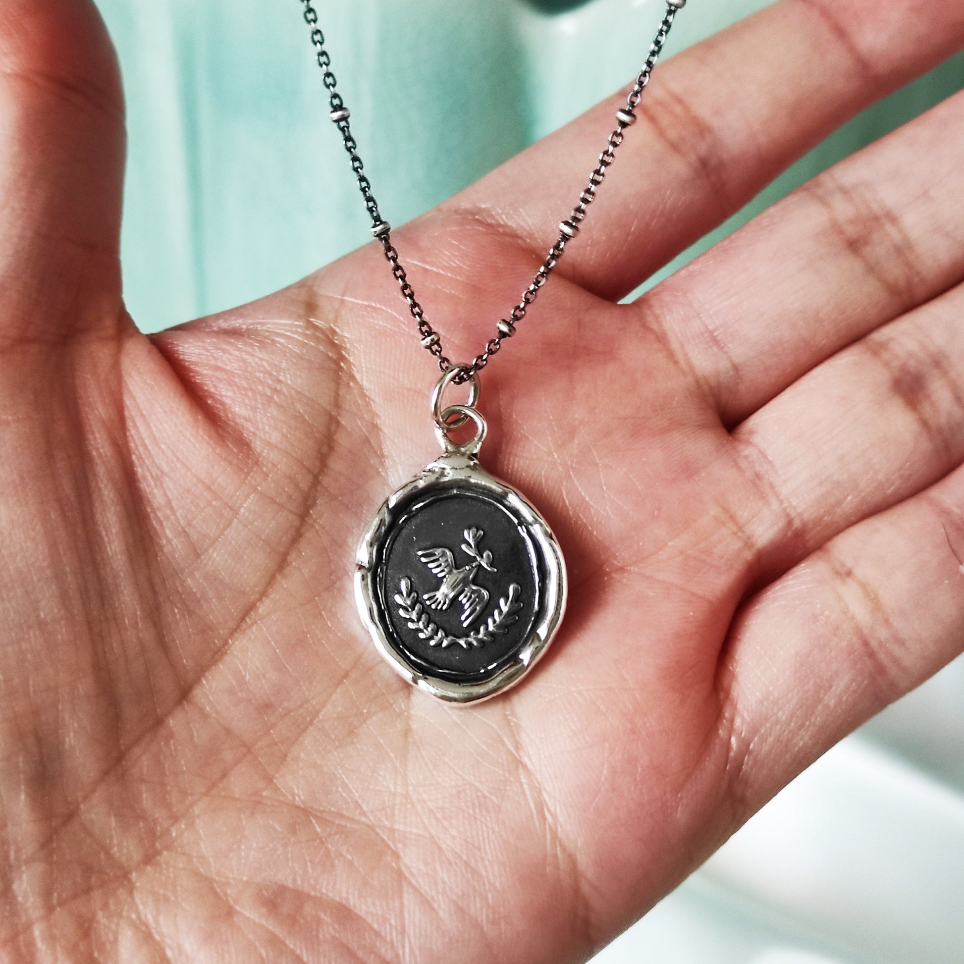 Our handcrafted silver pendant features a classic wax seal design of a dove carrying an olive branch, framed by laurel leaves—an enduring symbol of peace, reconciliation, and renewal. The gently uneven edges give it an organic, old-world charm that feels both meaningful and timeless.