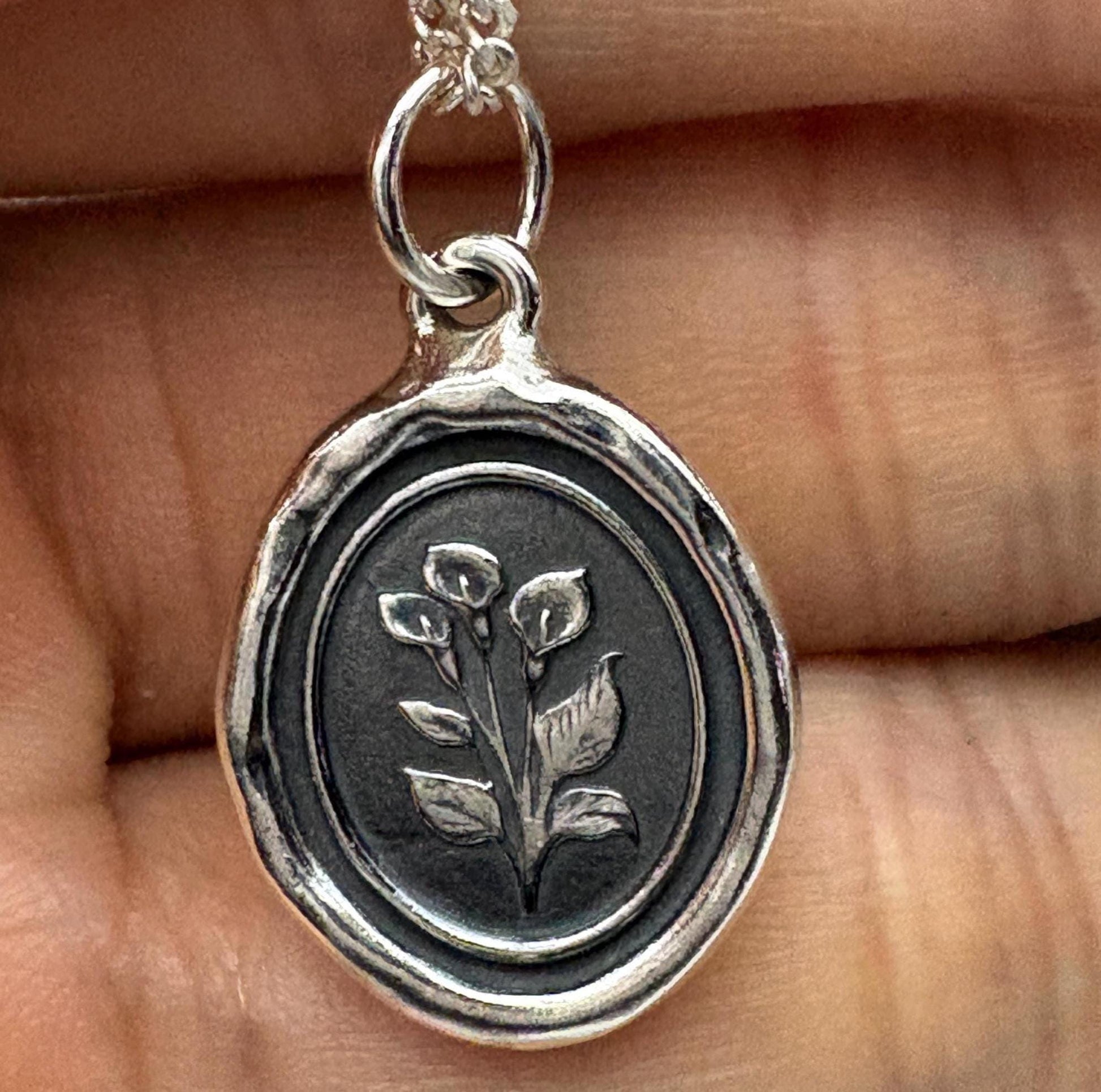 Elegant and timeless, our handcrafted sterling silver calla lily pendant draws inspiration from antique wax seals. The delicate calla lilies symbolize purity, rebirth, and transformation, making this piece a meaningful and beautiful keepsake.