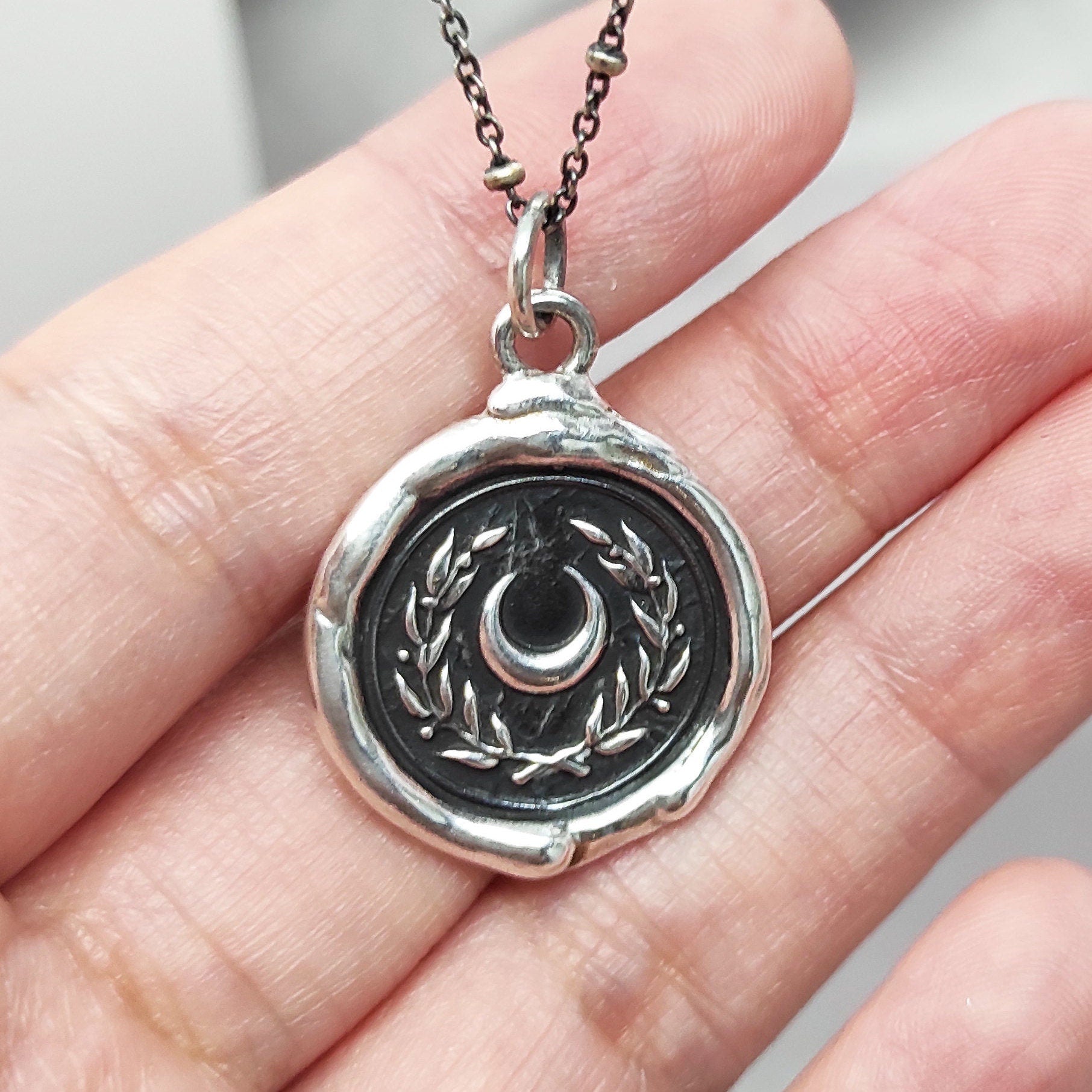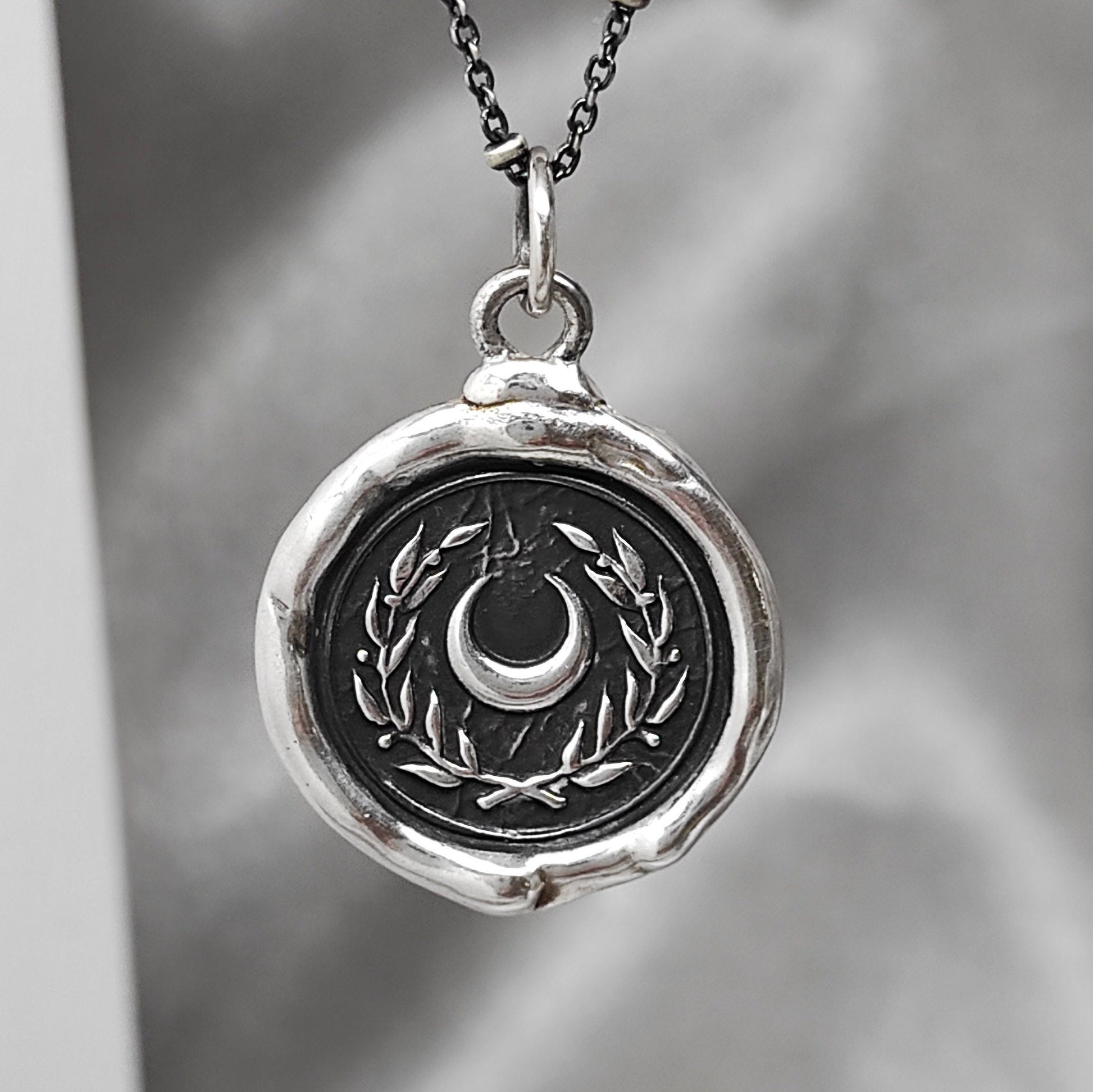 Crescent Moon and Wreath Wax Seal Necklace – Handmade Silver Intaglio Pendant, Celestial Heirloom Design by Liliane Ting, LT018