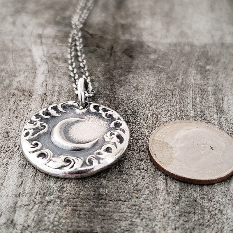 Crescent New Moon Cloud Pendant, Wax Seal Necklace, Handmade Silver Charm, Original Design by Liliane Ting LT059
