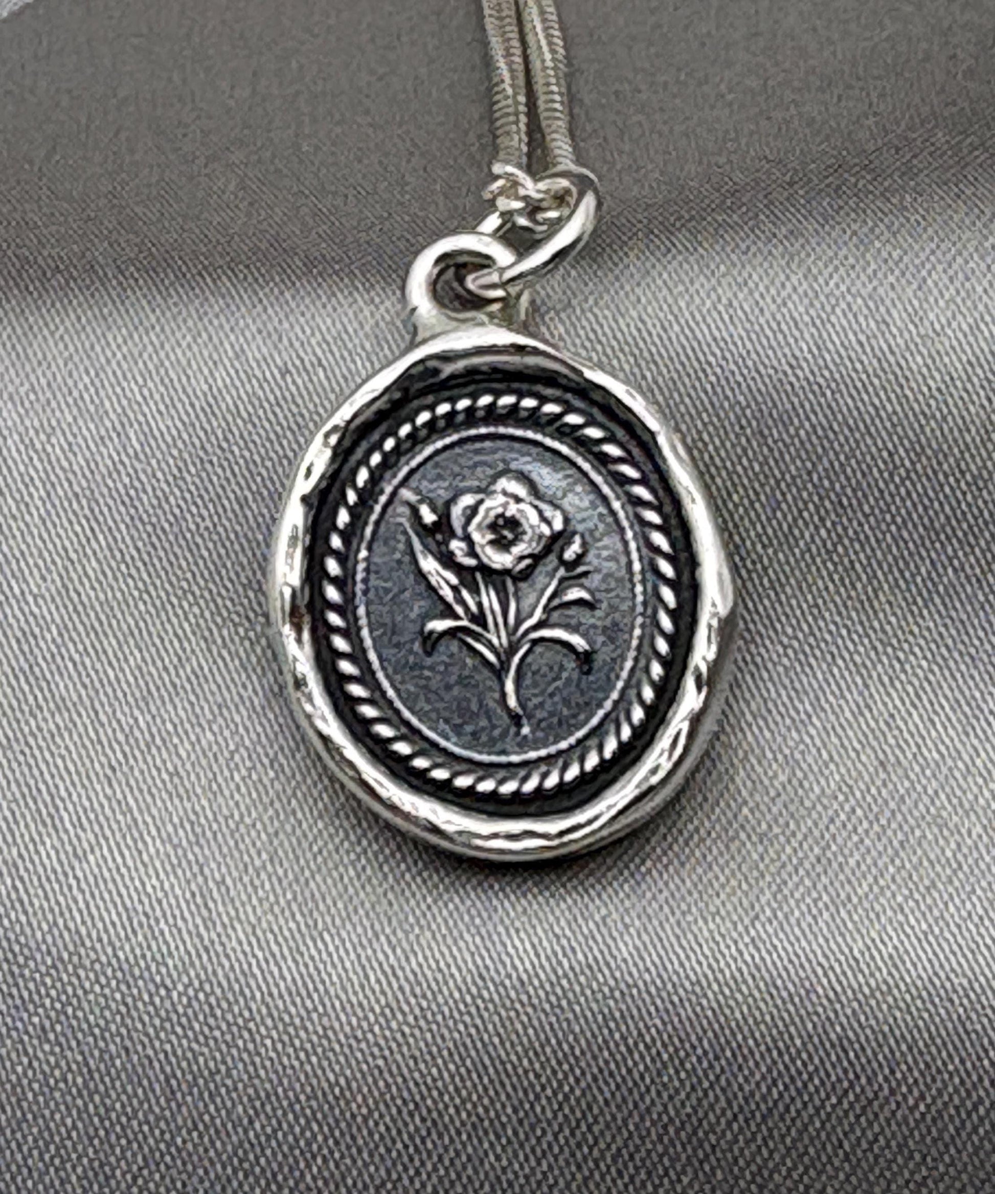 Celebrate new beginnings and timeless beauty with our handcrafted sterling silver daffodil pendant, featuring a graceful floral bloom sculpted in an antique wax seal style. Symbolizing hope, renewal, and joy, the daffodil makes this pendant a meaningful gift for a loved one—or a daily reminder of resilience and optimism.
