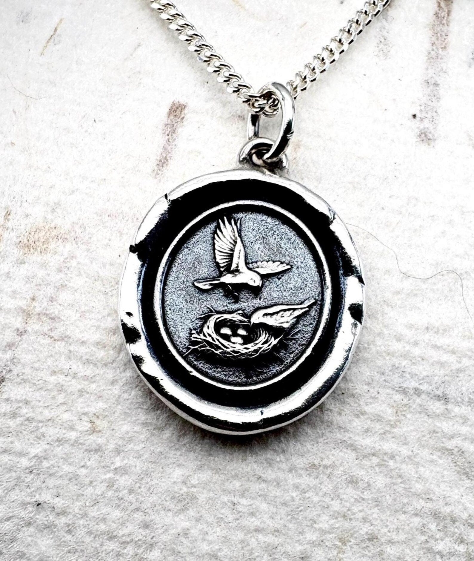 Birds & Nest Wax Seal Pendant, Symbol of Nurture, Renewal, and Hope, Handmade Solid Silver Talisman Necklace, Intaglio Heirloom Design by Liliane Ting