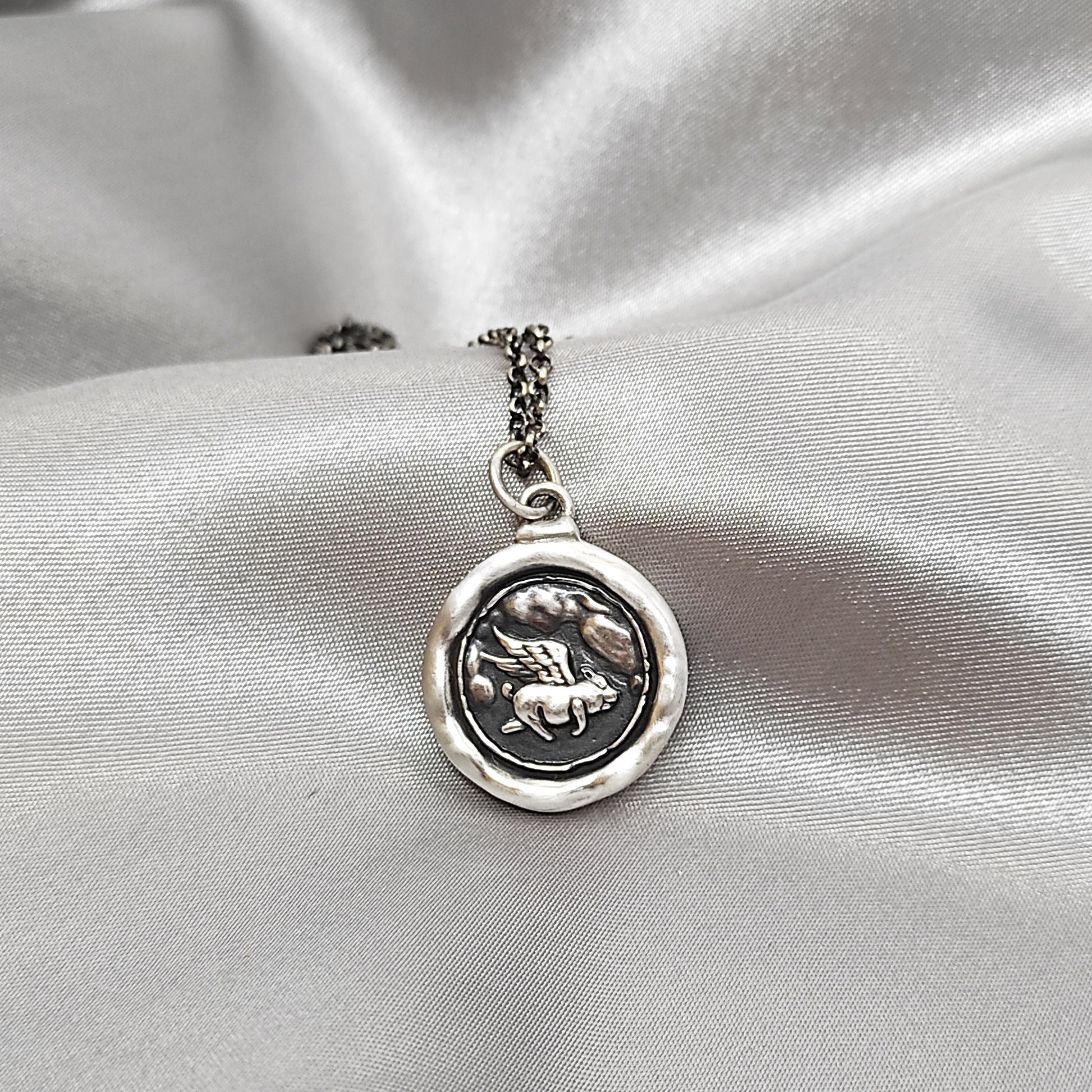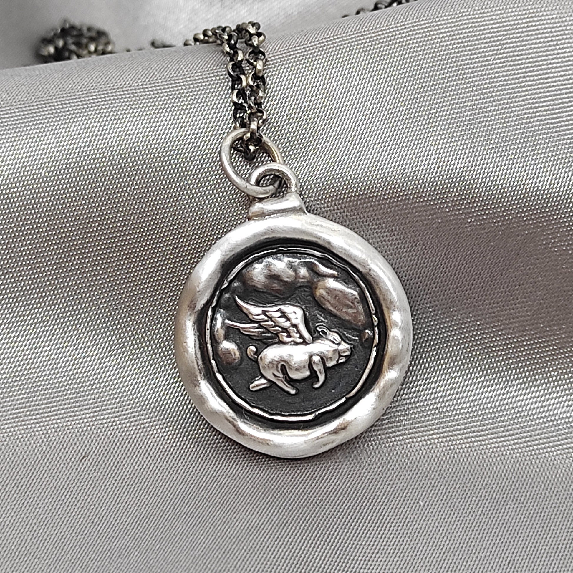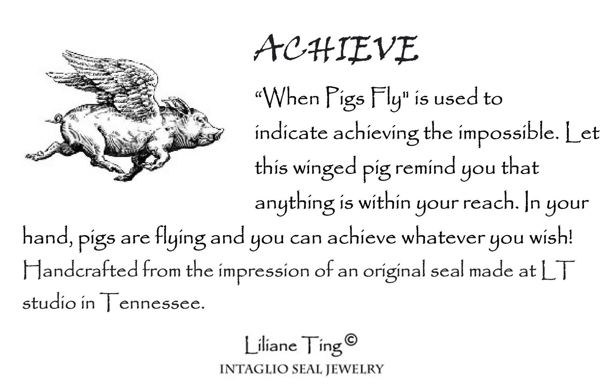 Flying Pig Wax Seal Necklace – "Achieve" Handmade Silver Intaglio Pendant, Whimsical Heirloom Design by Liliane Ting, LT022