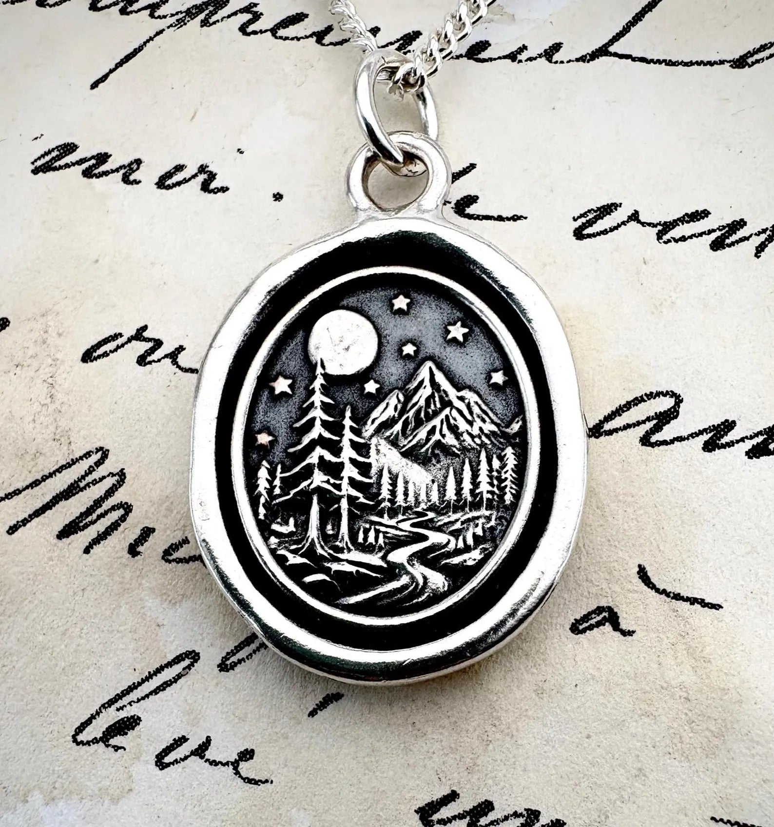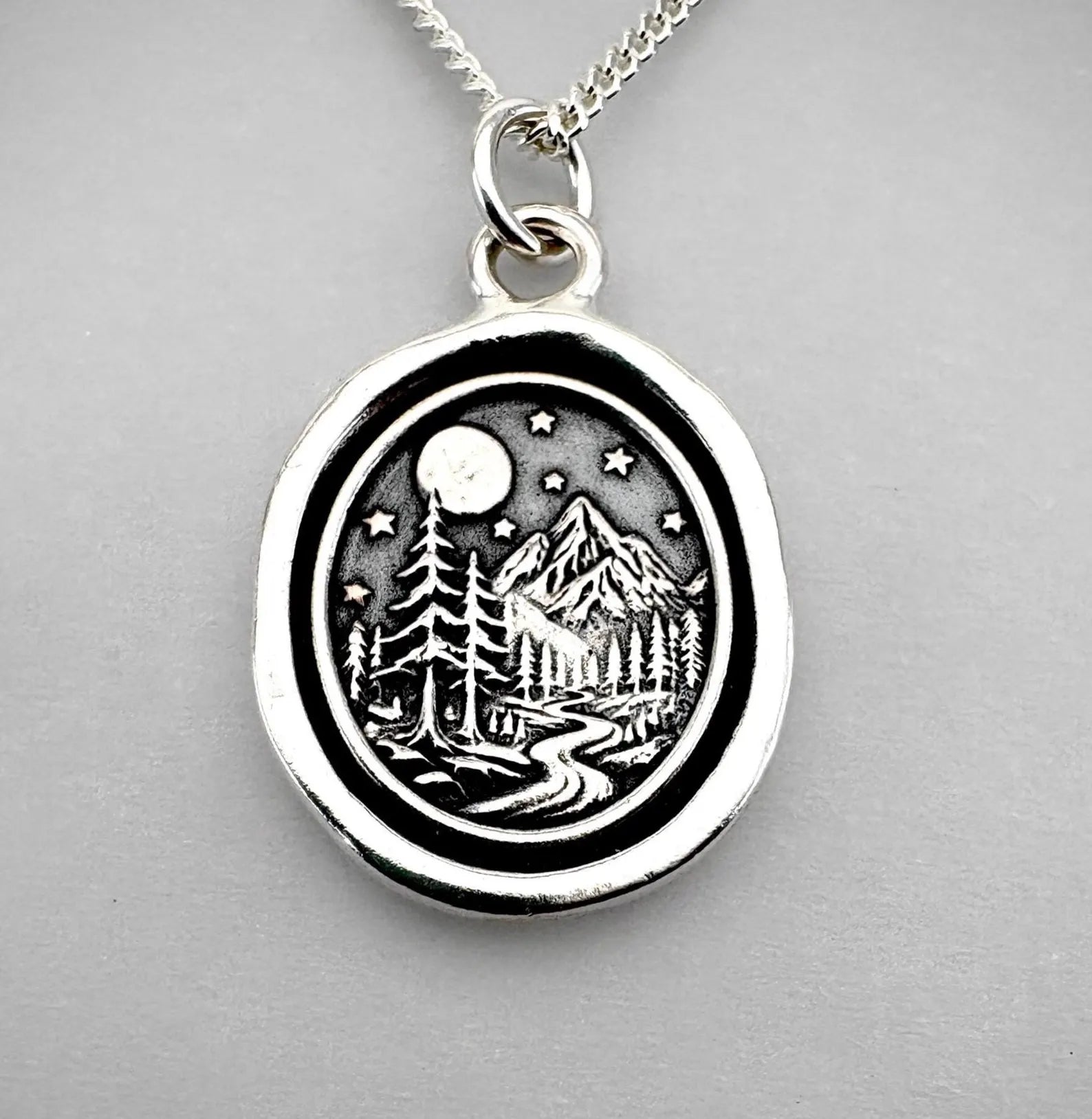Our newly handcrafted silver pendant captures the serenity of a moonlit mountain scene—towering pines, winding trails, and starlit skies carved in timeless wax seal style. A tribute to quiet journeys, wilderness wisdom, and the peaceful rhythm of nature. Whether you’re a hiker, dreamer, or stargazer, this piece is a gentle reminder to follow your path and trust the stillness of the night.