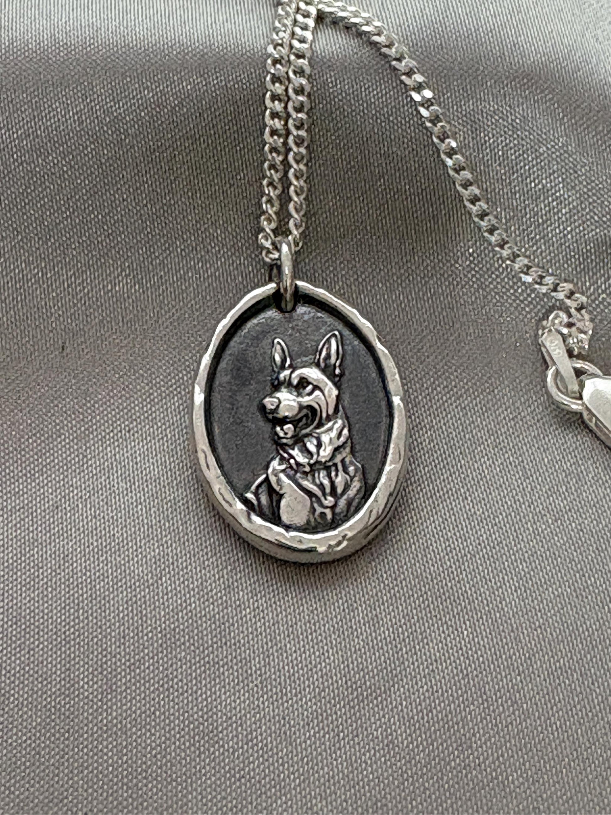 German Shepherd Dog Wax Seal Necklace Pendant Handmade Silver Talisman/Intaglio Seal, Original Design Liliane Ting LT100
