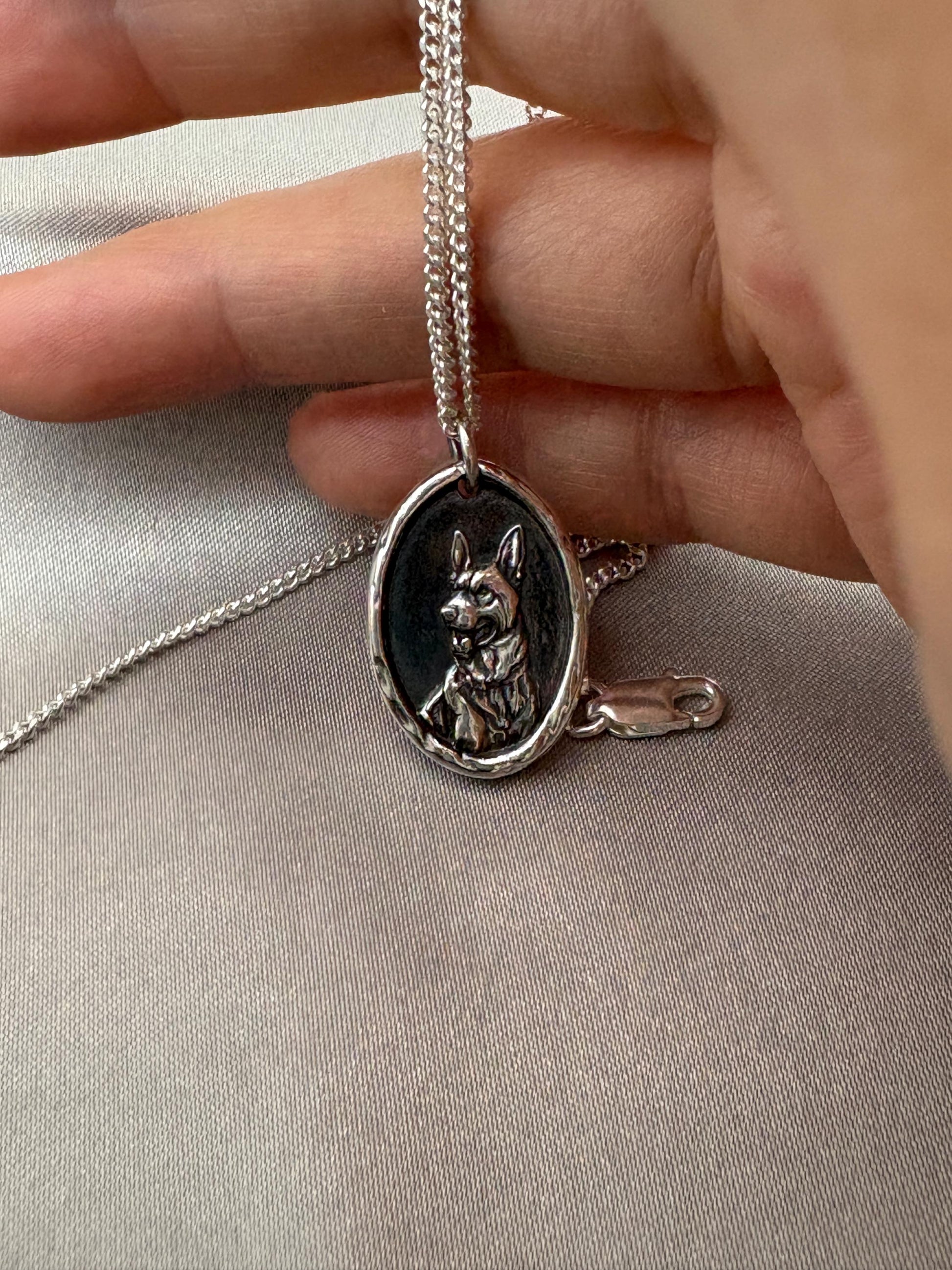 I just handcrafted this little piece that captures the noble and loyal spirit of the German Shepherd dog, etched in fine detail within an oval frame. The rustic, antique-inspired finish highlights the intricate craftsmanship, giving the piece a vintage feel that appeals to dog lovers and jewelry enthusiasts alike.