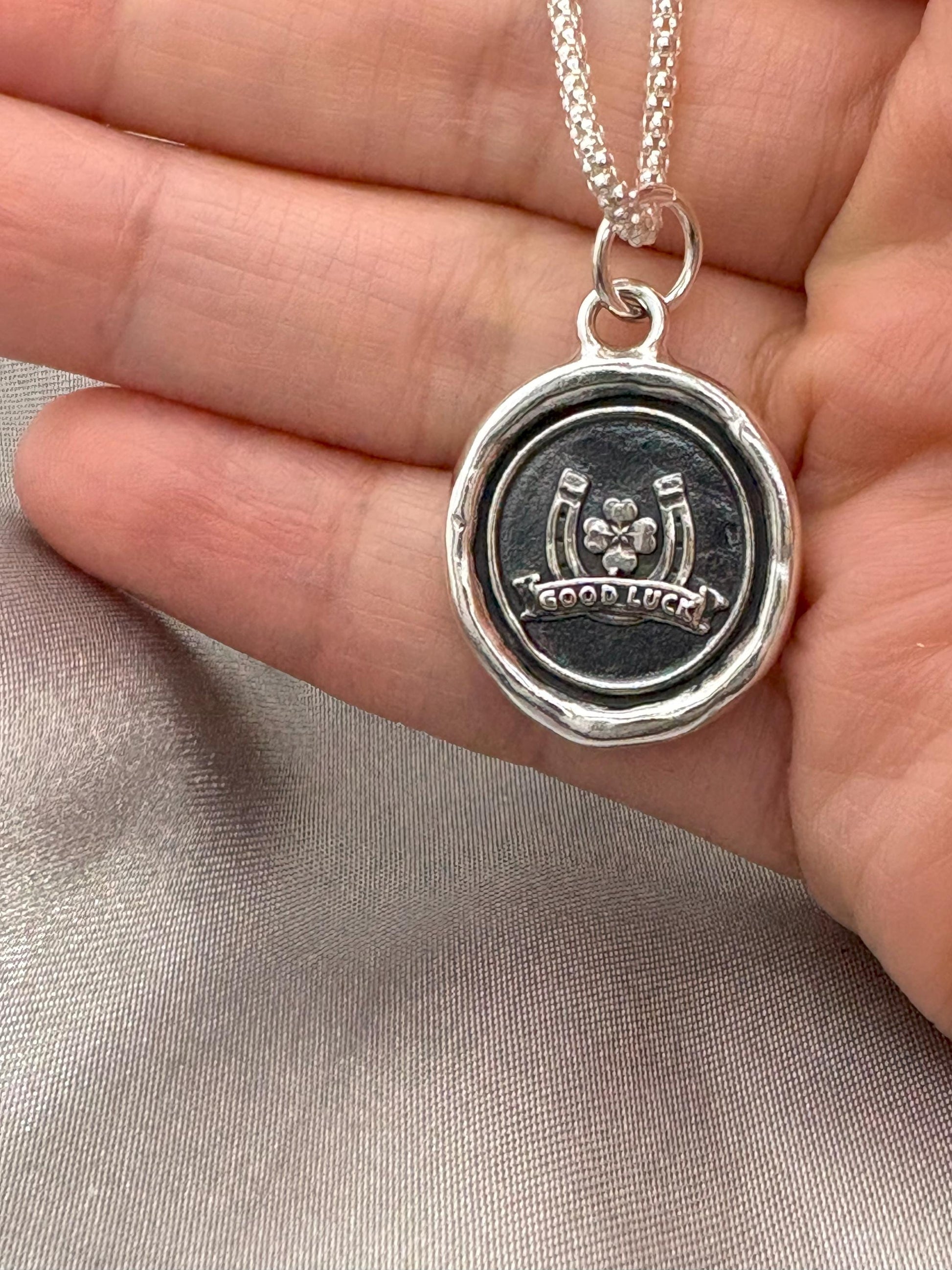 Carry a symbol of fortune and positivity with our beautifully handcrafted silver Good Luck pendant. Designed in a vintage wax-seal style, this pendant features a detailed horseshoe and four-leaf clover, both classic emblems of luck and protection.