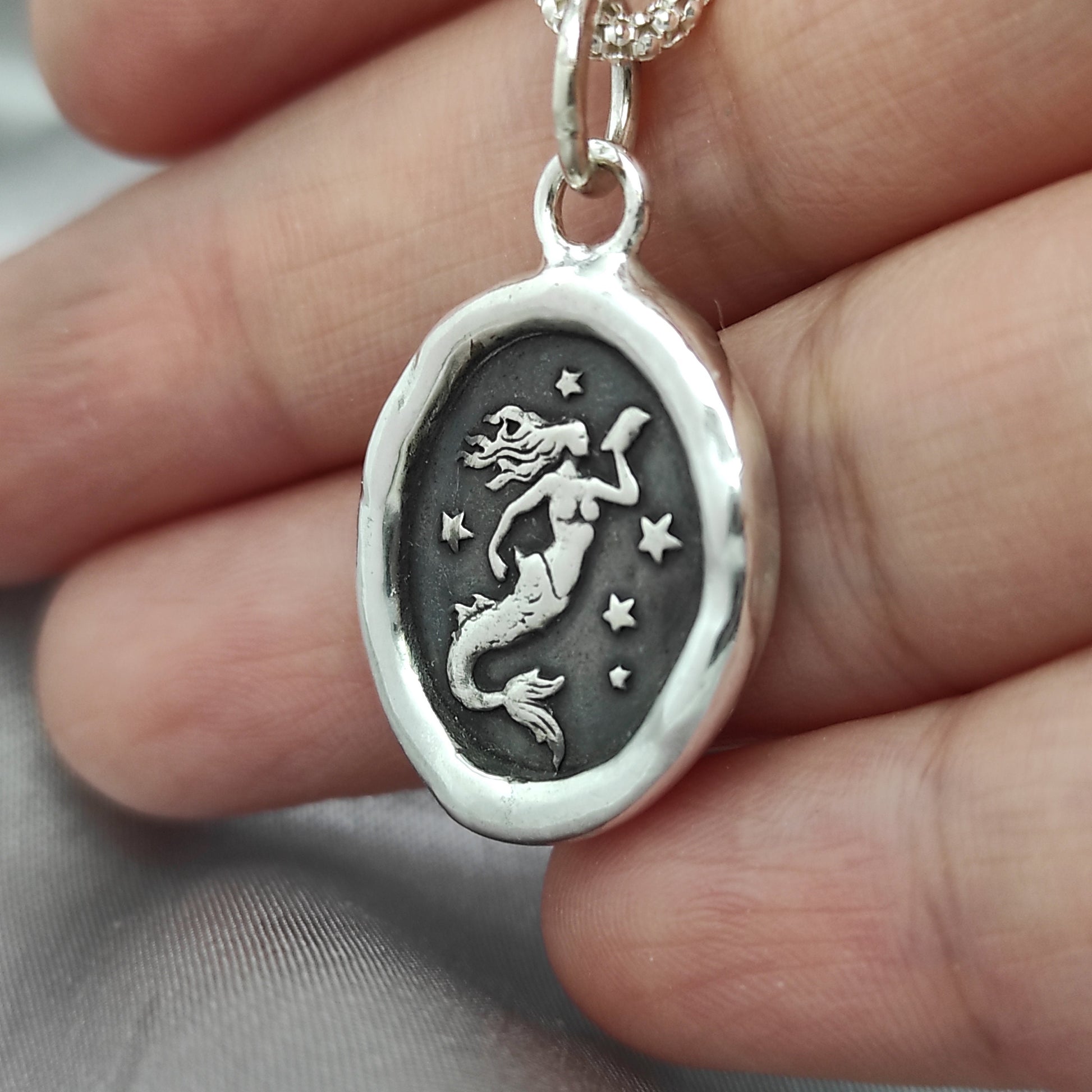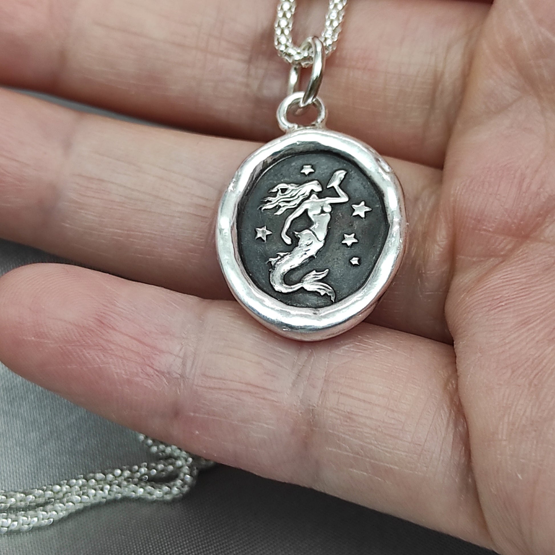 Mermaid Wax Seal Necklace – Handmade Silver Celestial Intaglio Pendant, Heirloom Design by Liliane Ting, LT073