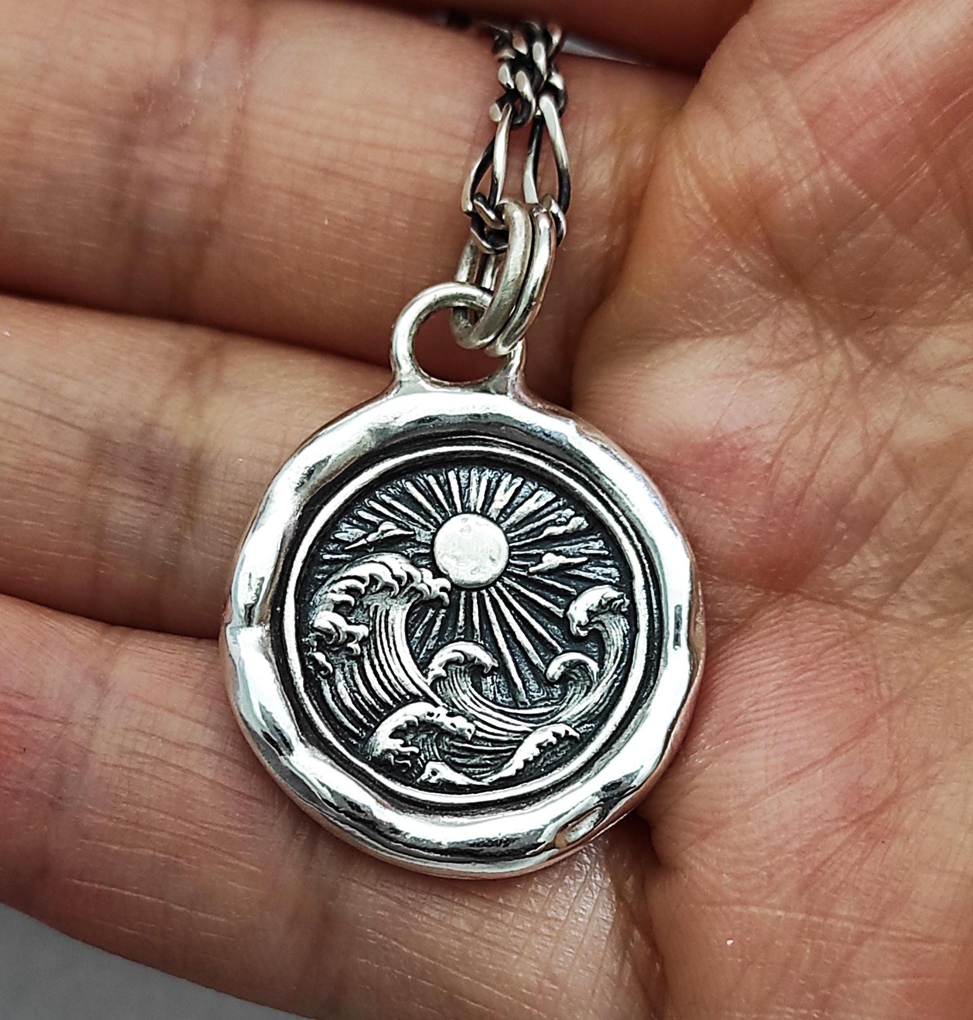 Ocean Wave Sun Wax Seal Necklace Pendant, Handmade Silver Talisman, Intaglio Seal Heirloom, Original Design by Liliane Ting 085