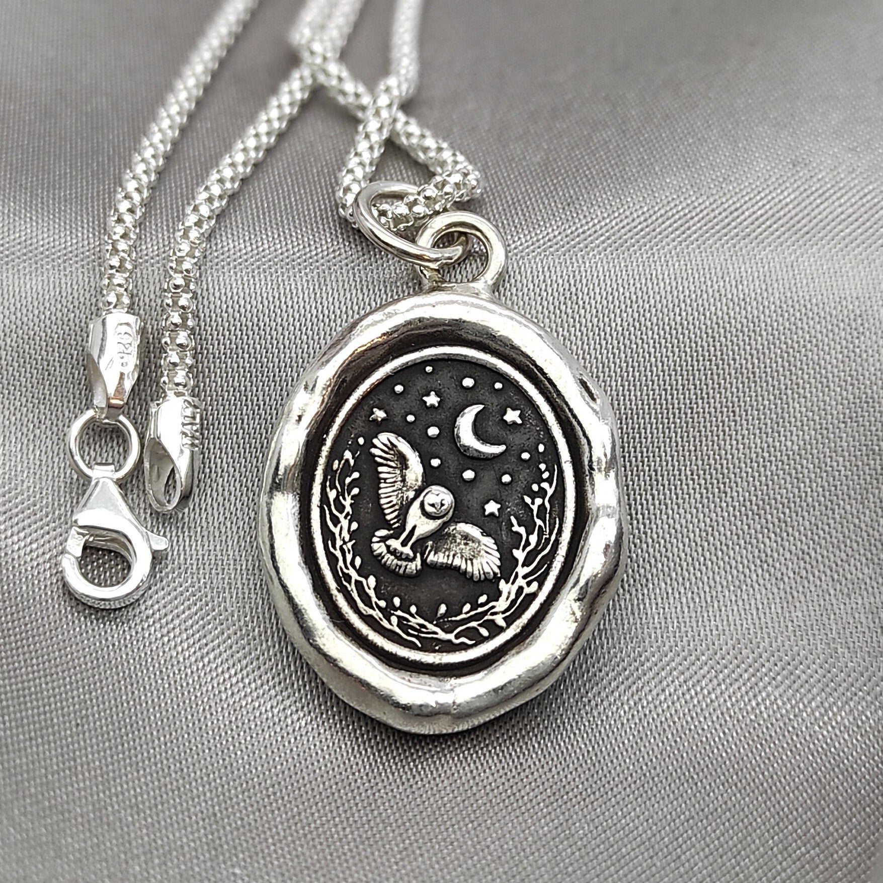 Owl Celestial Star Night Wax Seal Necklace Pendant, Handmade Silver Talisman, Intaglio Seal Heirloom, Original Design LT Studio LT034