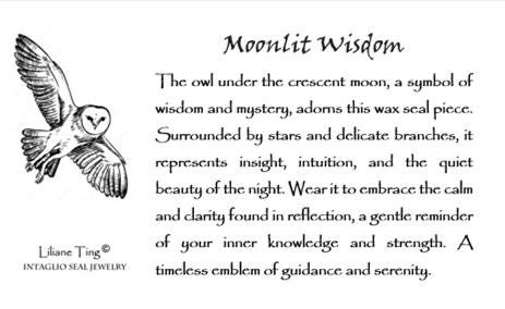 >>Moonlit Wisdom The owl under the crescent moon, a symbol of wisdom and mystery, adorns this wax seal piece. Surrounded by stars and delicate branches, it represents insight, intuition, and the quiet beauty of the night. Wear it to embrace the calm and clarity found in reflection, a gentle reminder of your inner knowledge and strength. A timeless emblem of guidance and serenity.