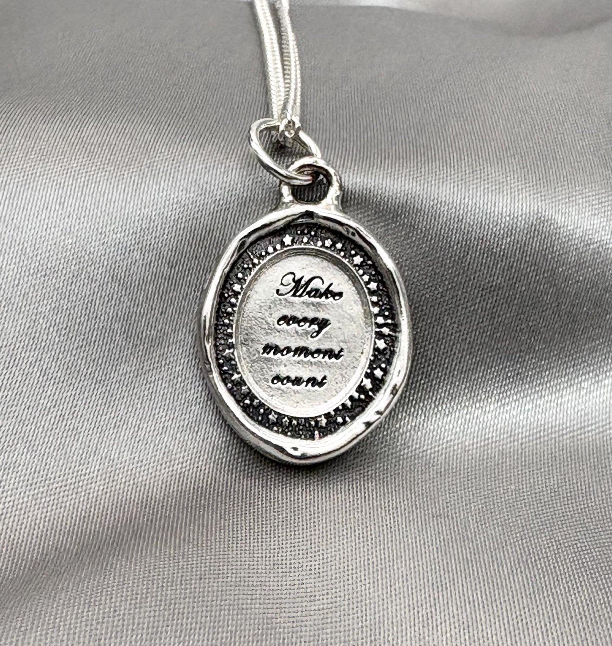 Keep inspiring words close to your heart with our handcrafted silver pendant. This exquisite piece features an engraved inspirational quote elegantly set within a vintage-style wax seal design, boasting the timeless phrase "Make Every Moment Count" as a daily reminder to embrace life’s journey.