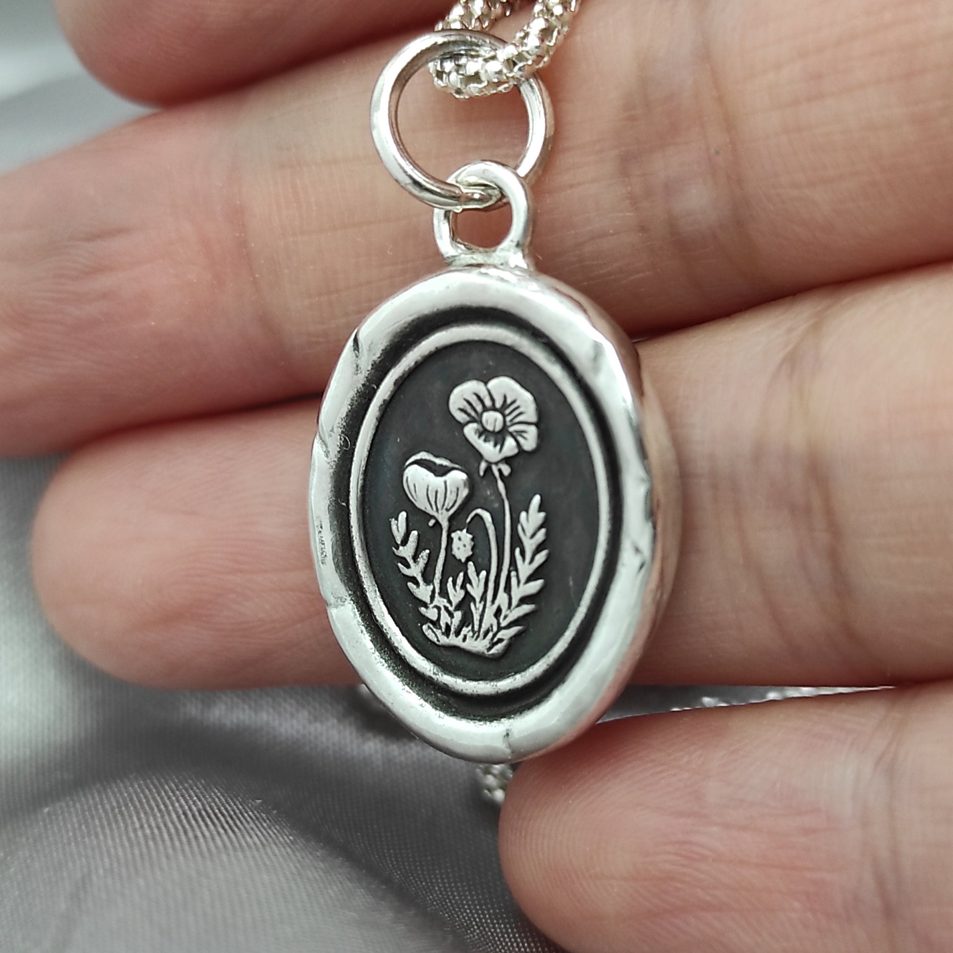 Poppy Flower Wax Seal Necklace – Celestial Intaglio Pendant in Handmade Silver, Heirloom Jewelry by Liliane Ting Studio LT074