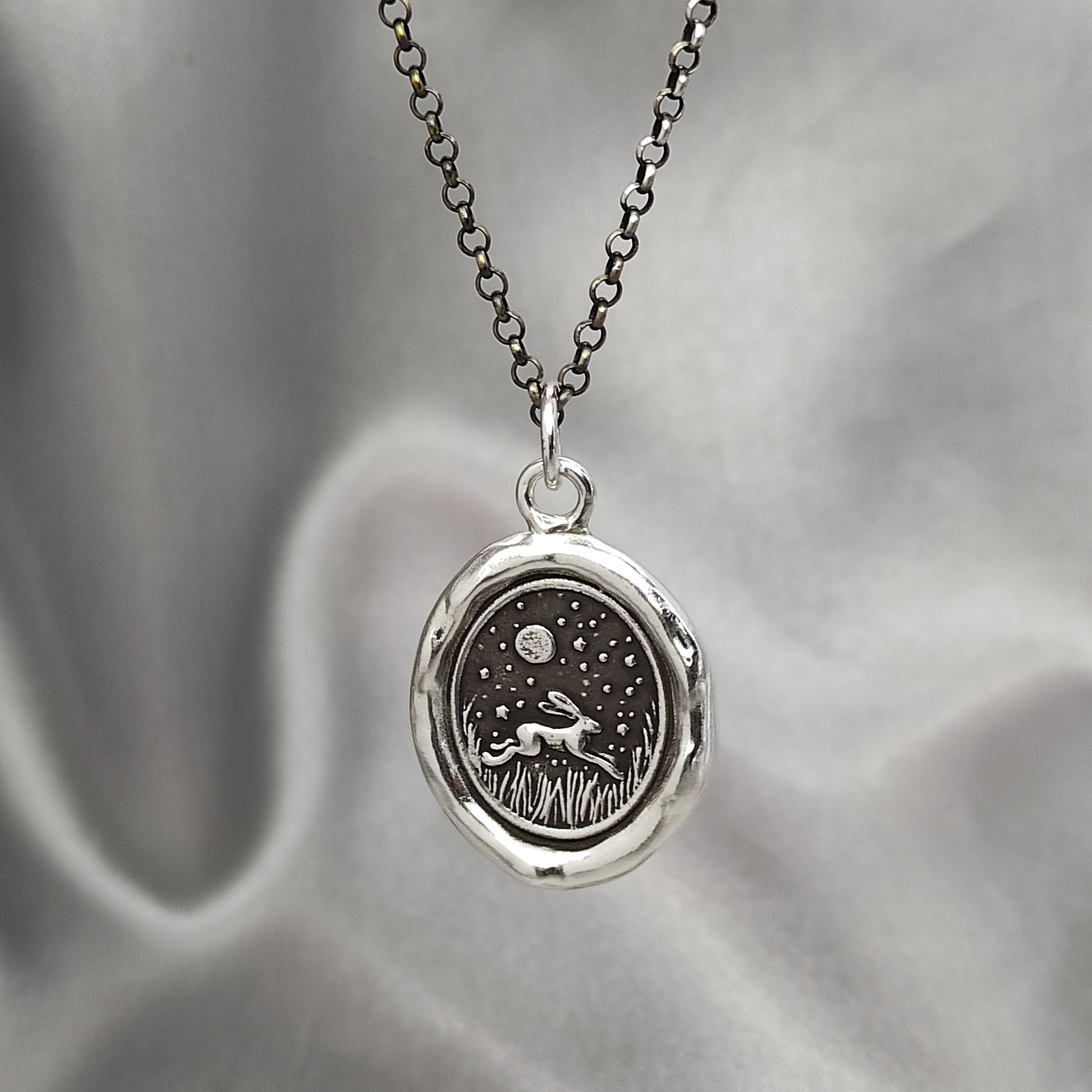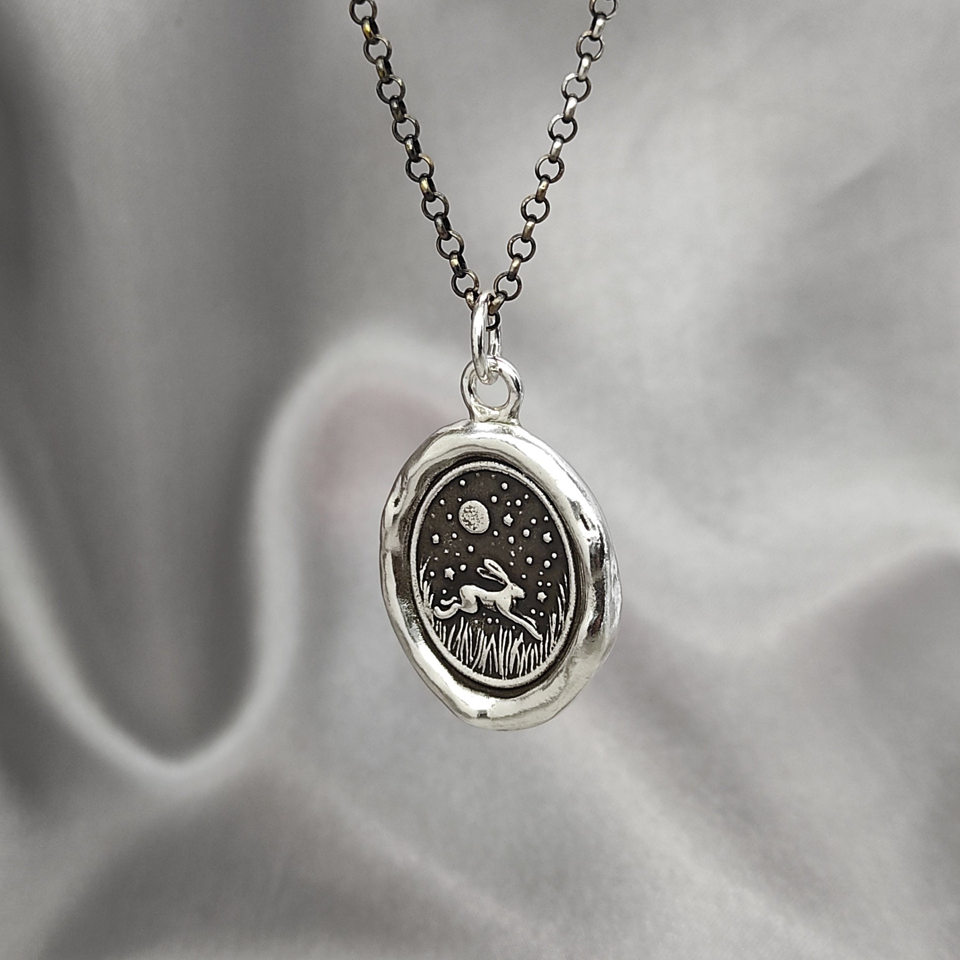 Rabbit Bunny Celestial Star Night Wax Seal Necklace Pendant, Handmade Silver Talisman, Intaglio Seal Heirloom, Original Design Liliane Ting