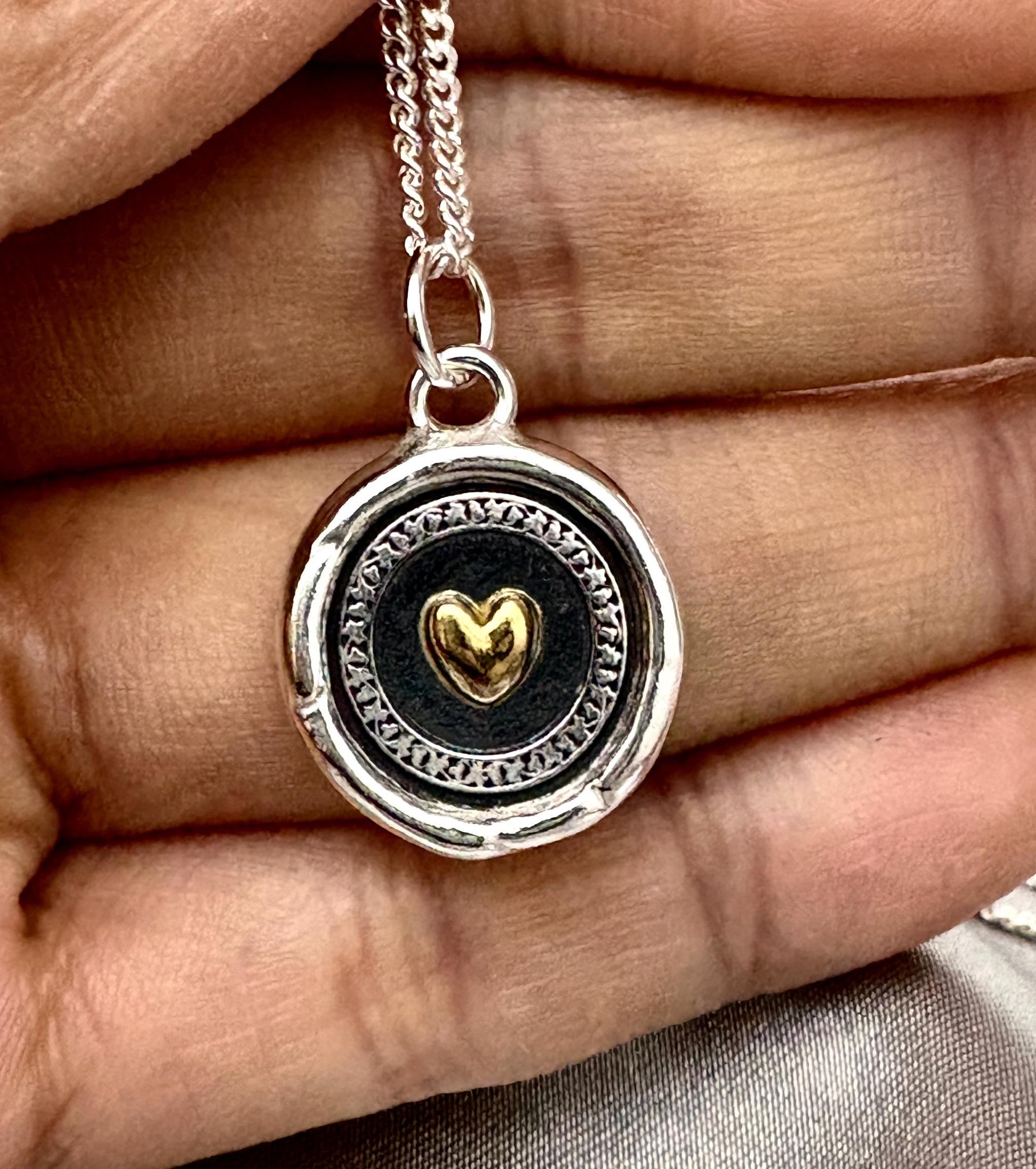 Romantic Heart Wax Seal Necklace – Handmade Fine Silver Pendant with 22K Gold Overlay, Intaglio Love Heirloom by Liliane Ting