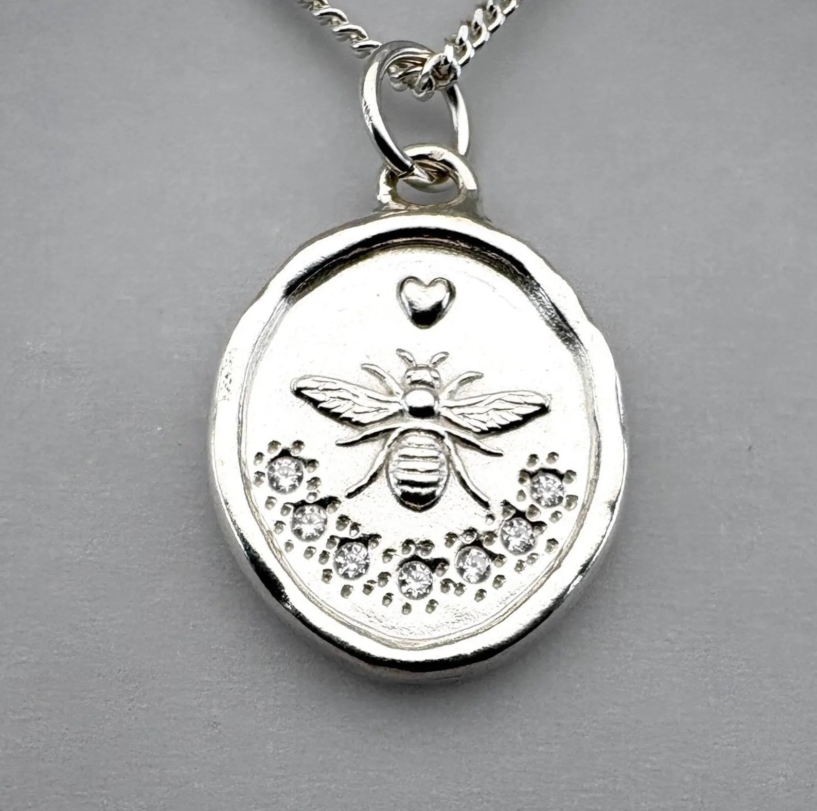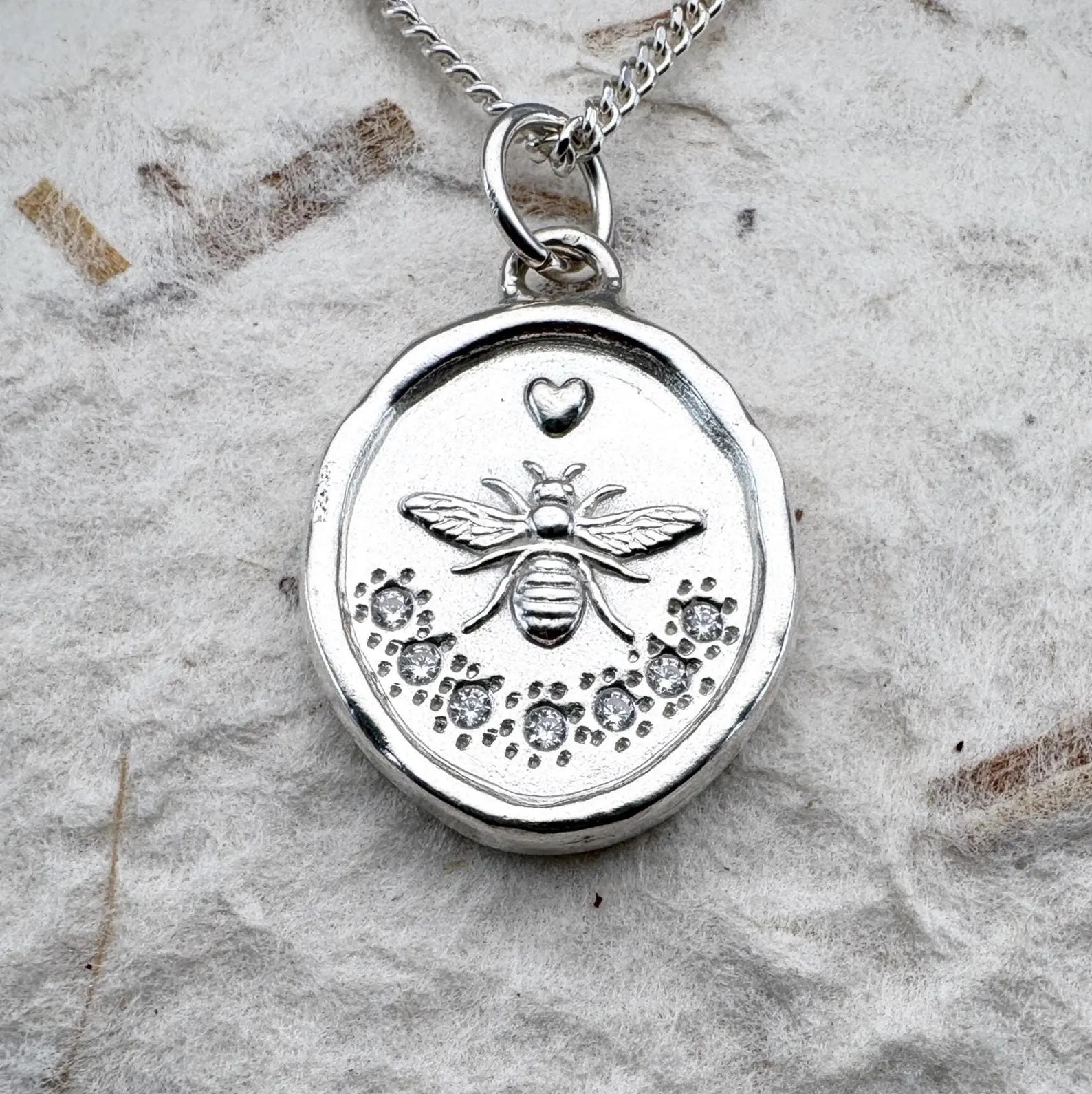 Bee Pendant with CZ Stones – Handmade Solid Silver Nature-Inspired Wax Seal Necklace, Intaglio Heirloom Design by Liliane Ting