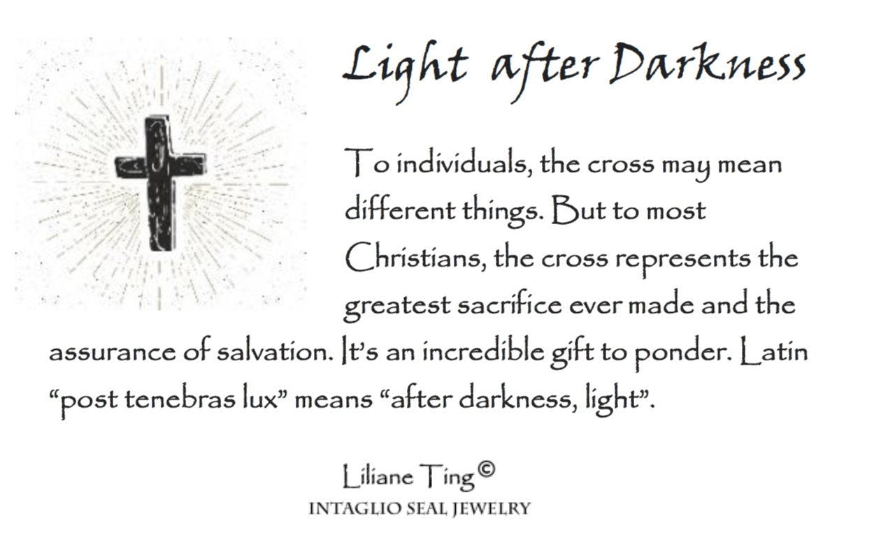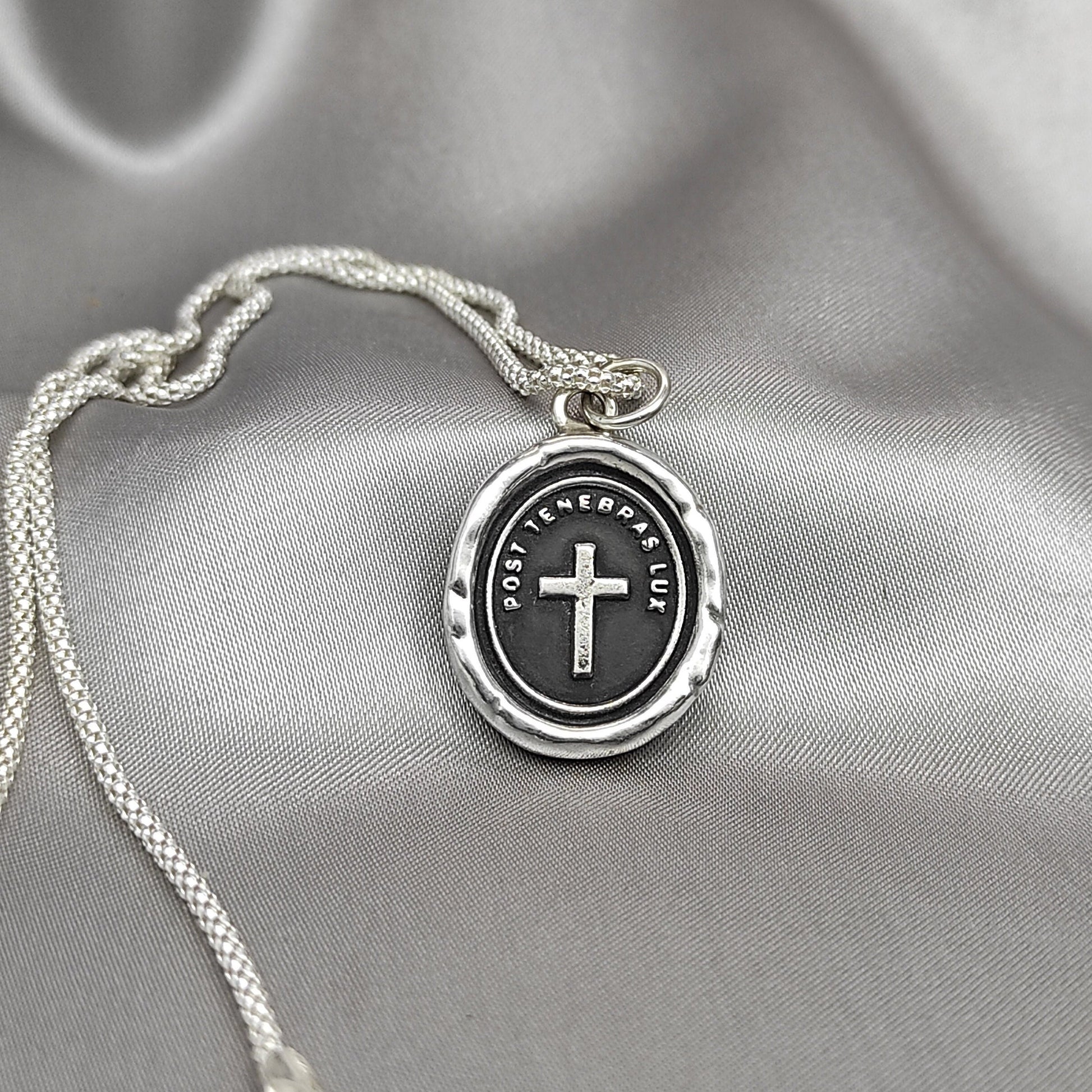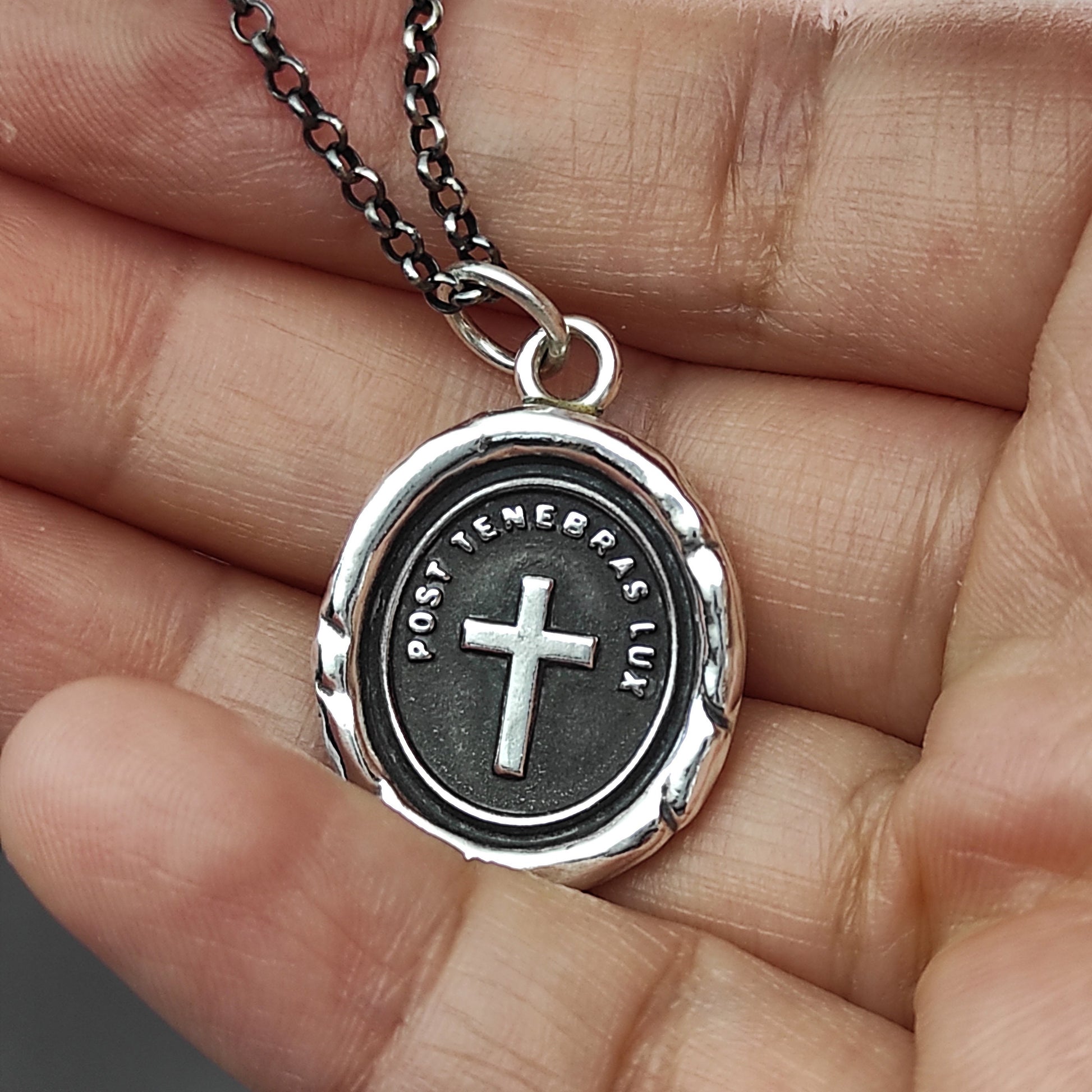 Our handcrafted sterling silver pendant features a cross framed by the Latin phrase Post Tenebras Lux – “After Darkness, Light.” Inspired by antique wax seals, this piece symbolizes hope, renewal, and divine guidance emerging through adversity.