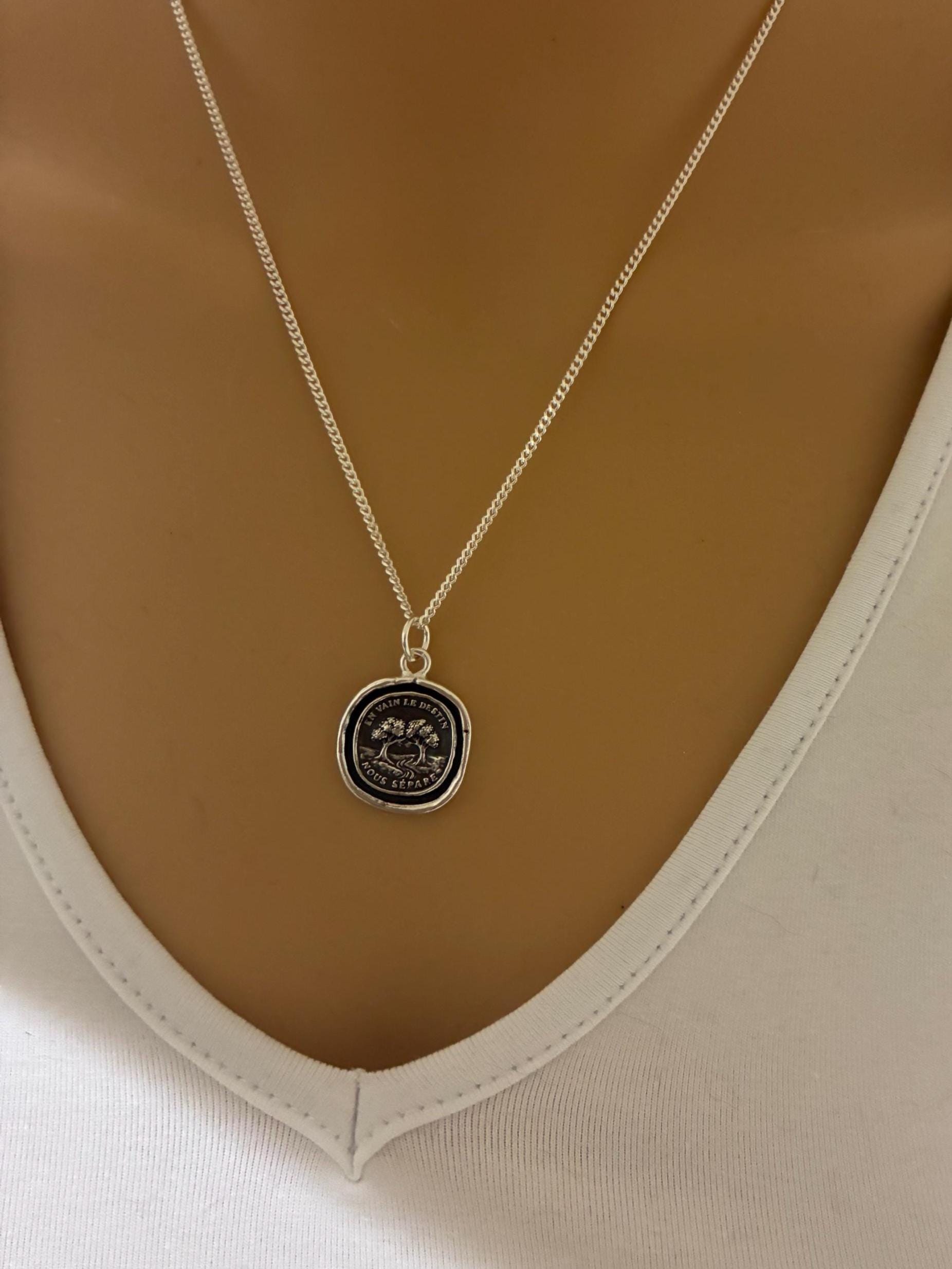 Silver “En Vain Le Destin Nous Sépare” Wax Seal Pendant – Soulmate Tree Necklace – Symbol of Eternal Bond and Love