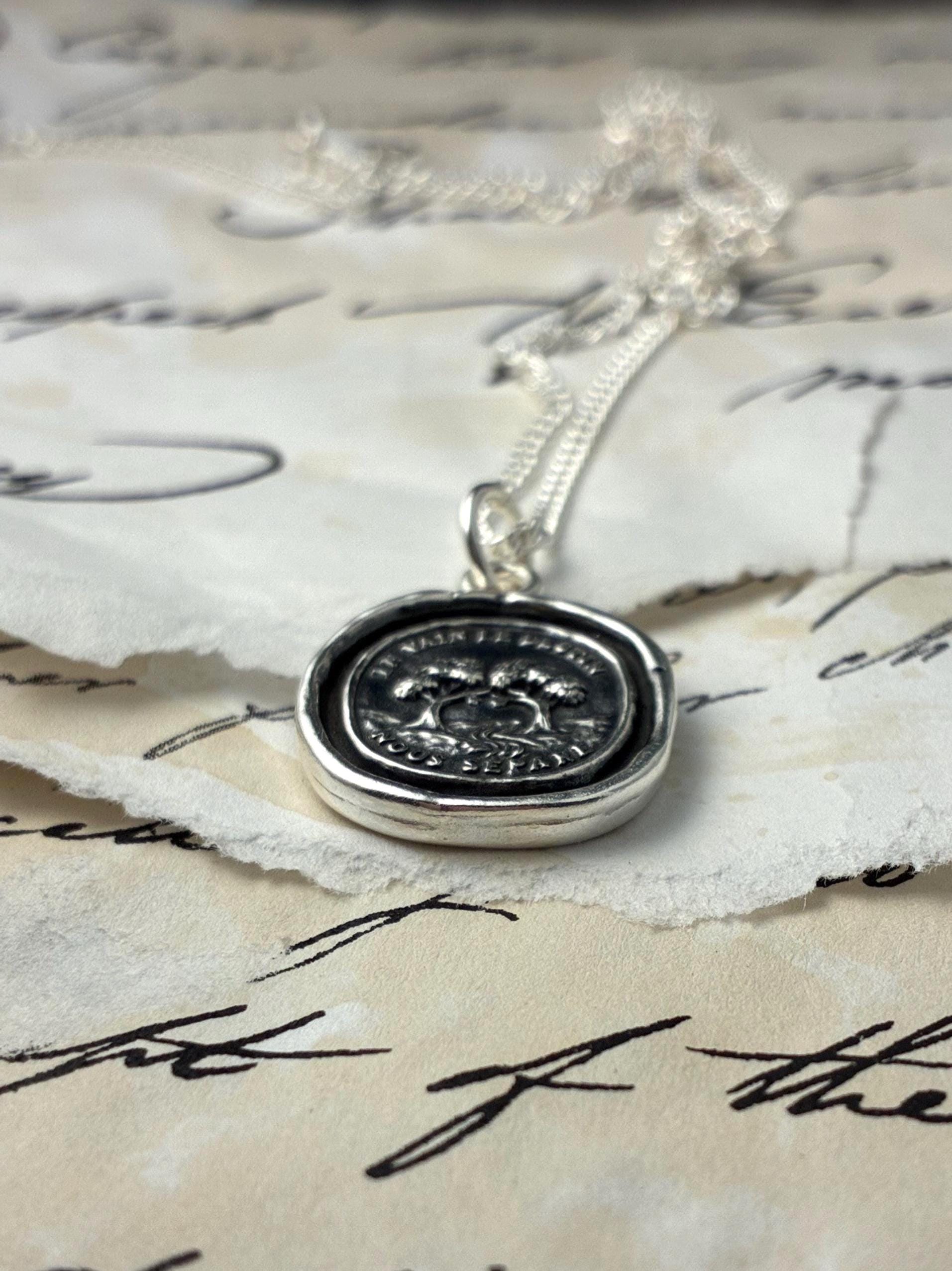 Silver Wax Seal Pendant – “En Vain Le Destin Nous Sépare” – Two Trees Symbol of Enduring Bond, Fate & Connection Necklace