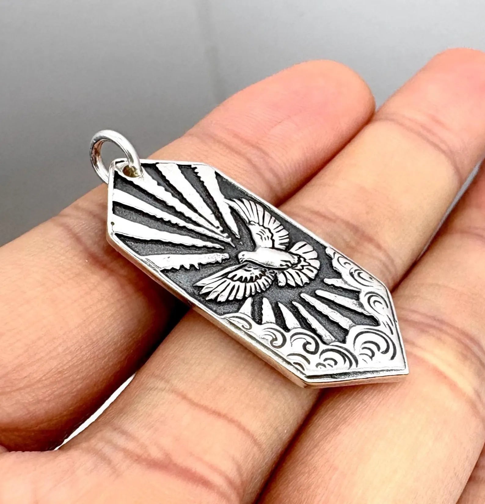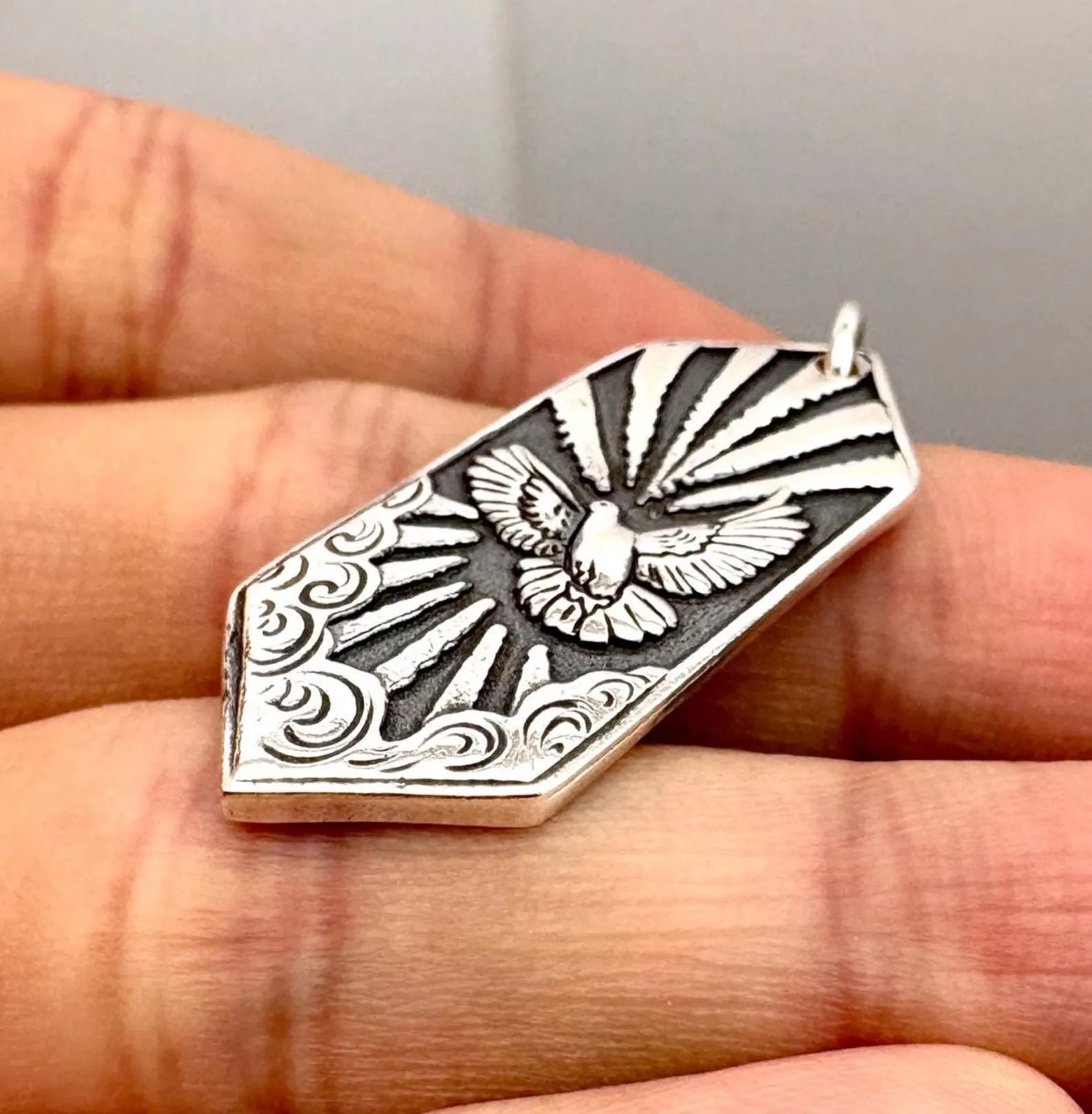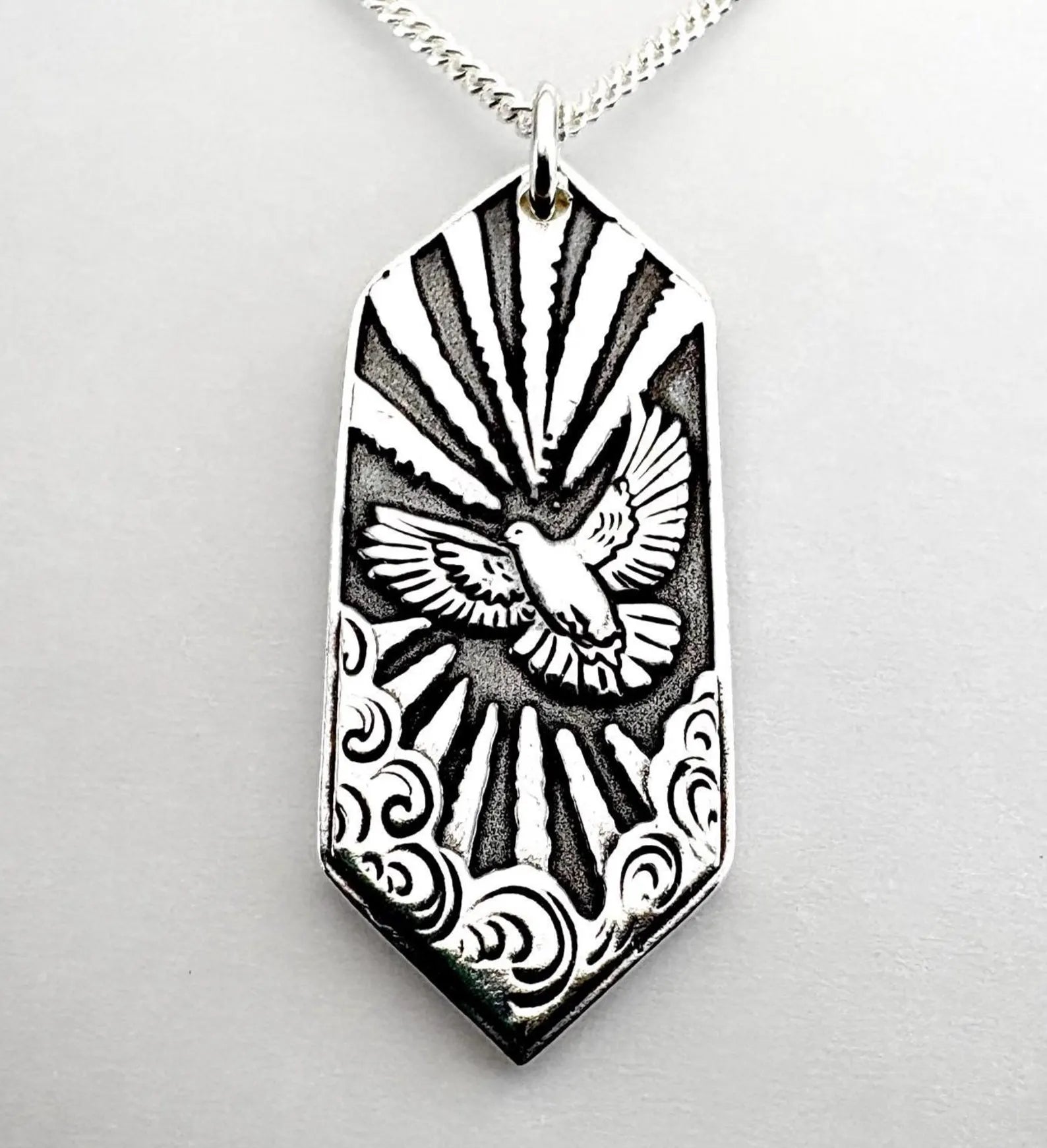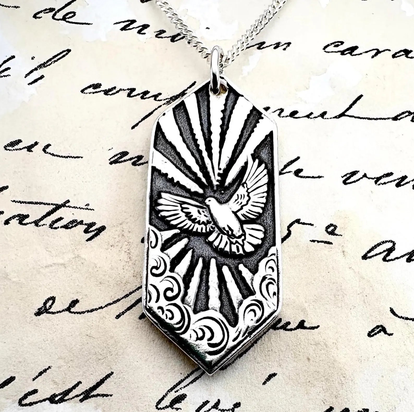 Our silver pendant captures a serene dove soaring amidst radiant sunbeams and swirling clouds — a timeless symbol of peace, renewal, and spiritual clarity. Handcrafted in solid silver, this intaglio-style wax seal pendant offers a quiet reminder to rise above and move forward with grace and light. The angular frame gives it a modern yet soulful touch — a perfect blend of celestial symbolism and elegant craftsmanship.