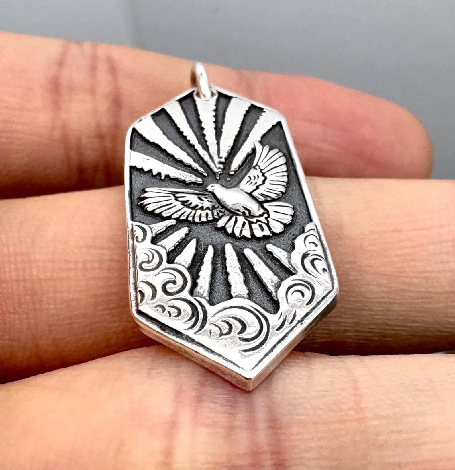 Dove in Radiant Sky Pendant • Handmade Silver Talisman of Hope & Peace • Sunbeam & Cloud Wax Seal Necklace • 40.5 * 16.6 mm • Original Design by Liliane Ting
