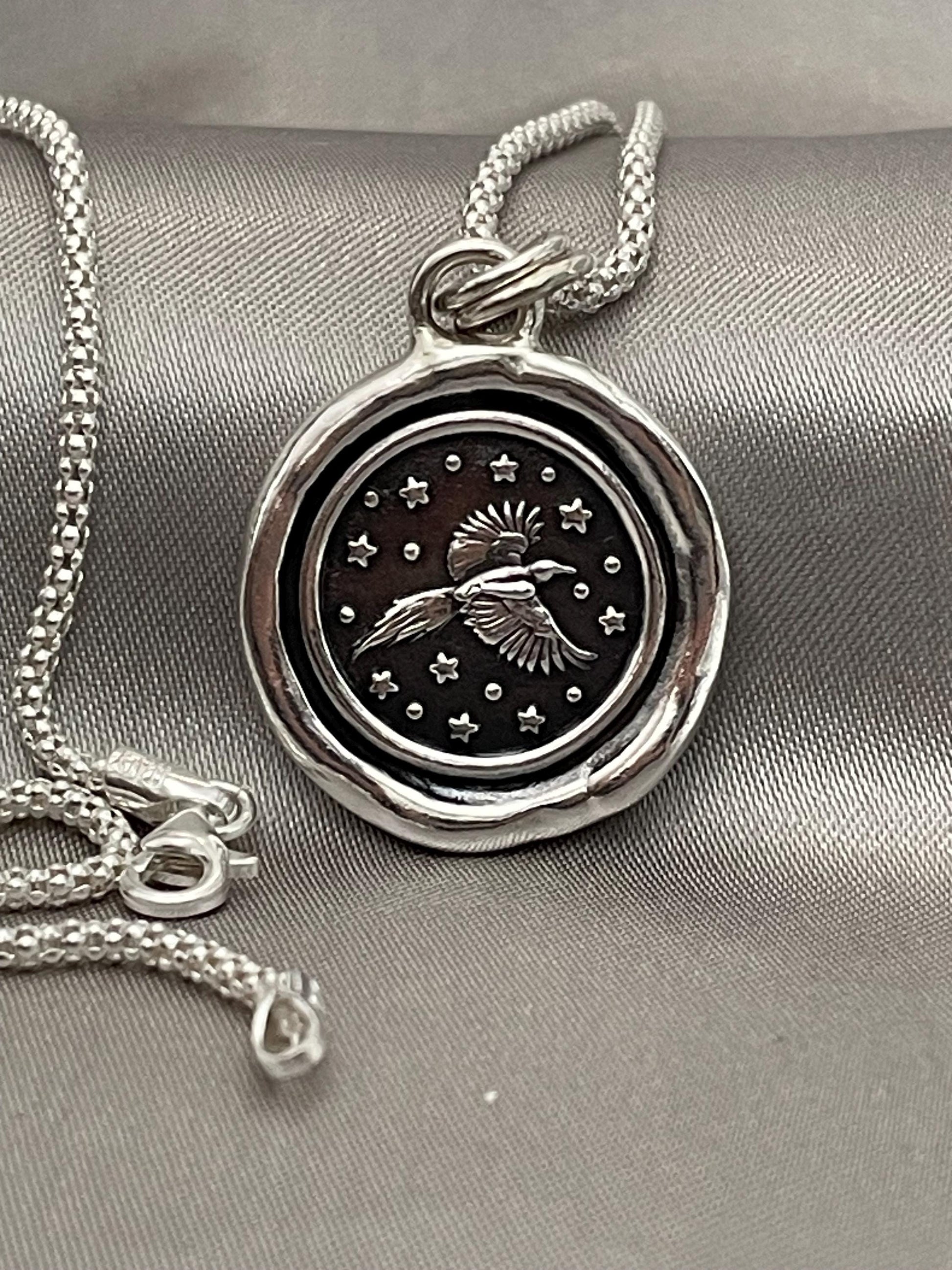 Soaring Bird Celestial Star Wax Seal Necklace Pendant, Handmade Silver Talisman, Intaglio Seal Heirloom, Original Design LT091