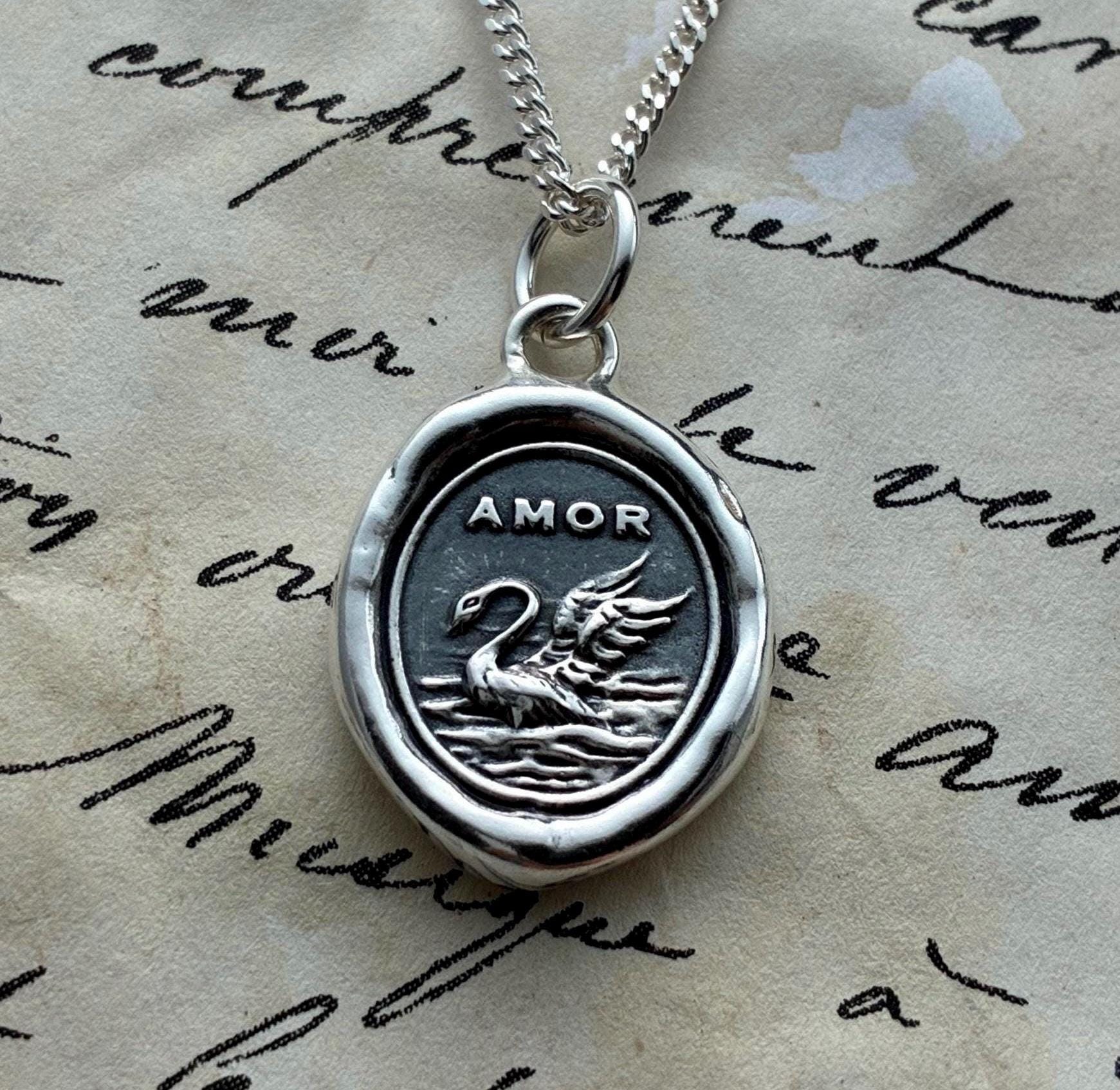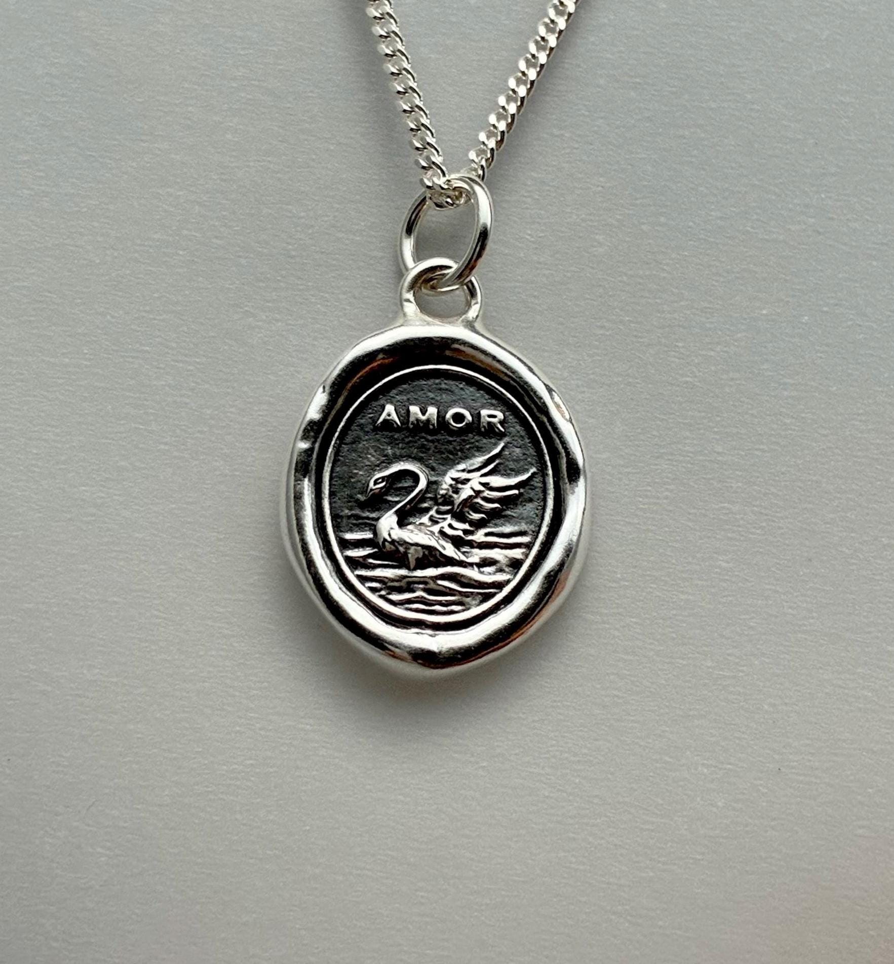 Swan Amor Love Wax Seal Necklace Pendant, Handmade Silver Talisman, Intaglio Seal Heirloom Original Design LT042