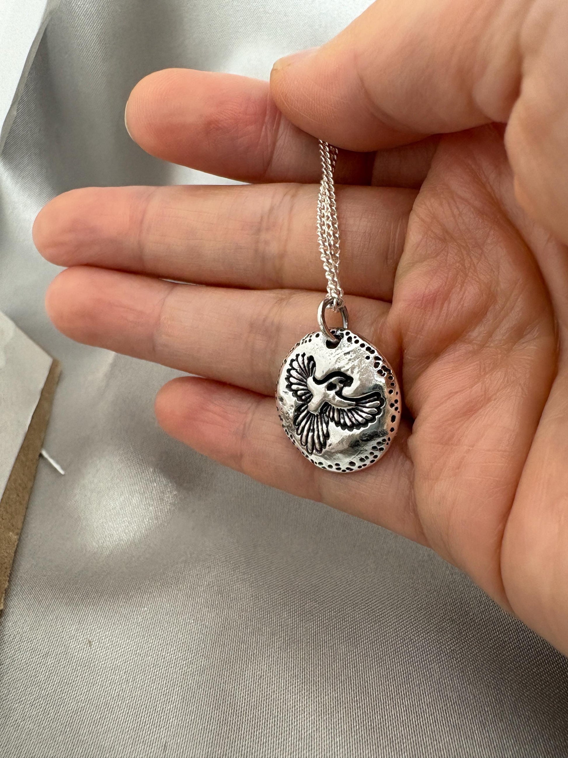 Our handmade sterling silver pendant showcases an intricately detailed bird in flight, symbolizing freedom, hope, and new beginnings. The bird's wings are gracefully spread, capturing a sense of movement and energy, while the textured circular background adds depth and character to the design. The oxidized details highlight the fine lines of the bird, making it stand out beautifully against the rustic silver backdrop.