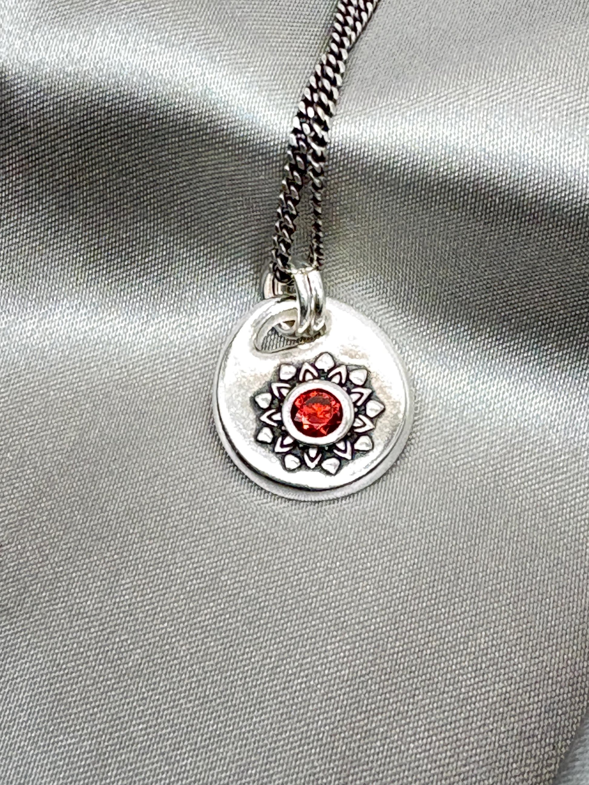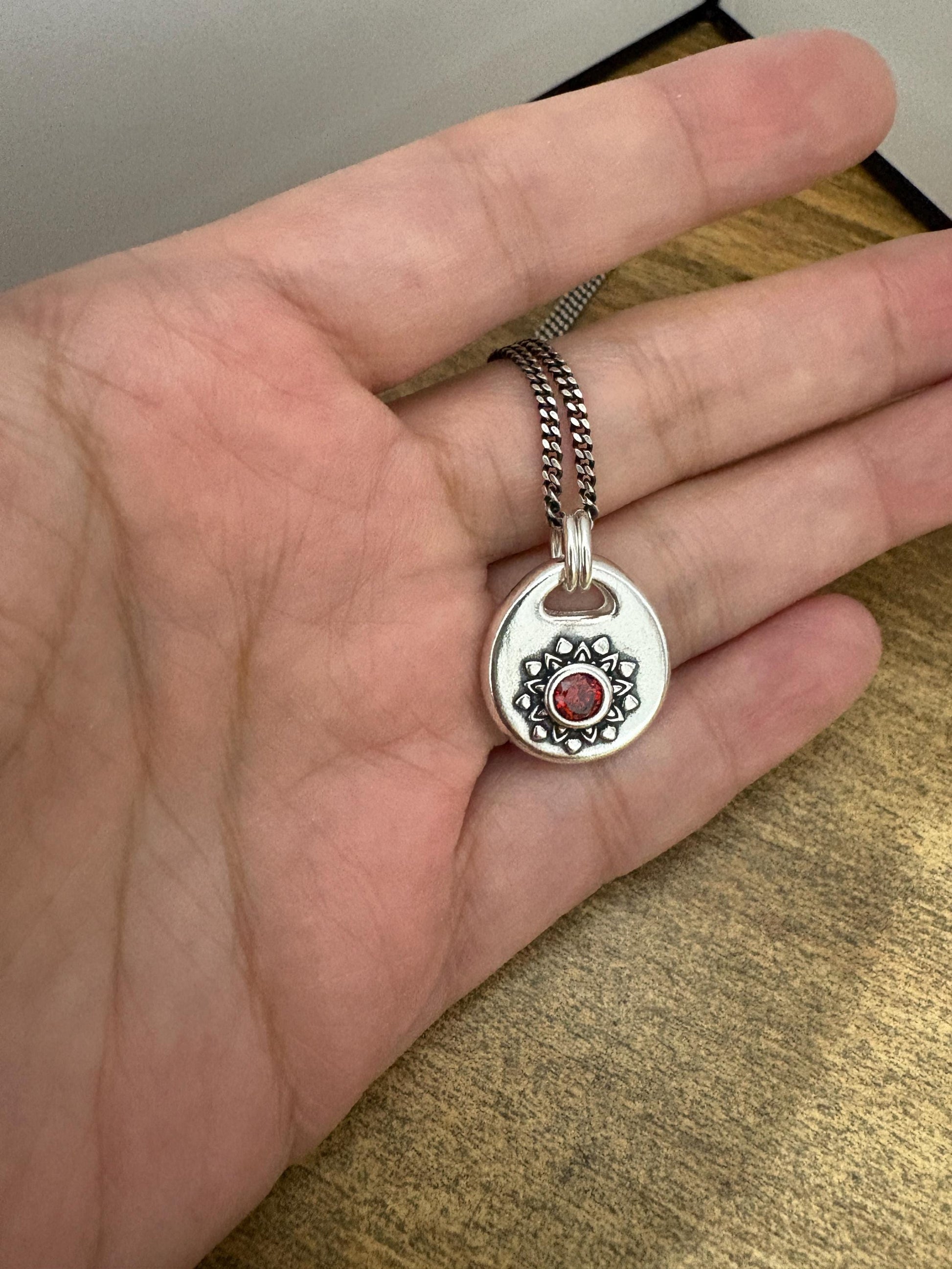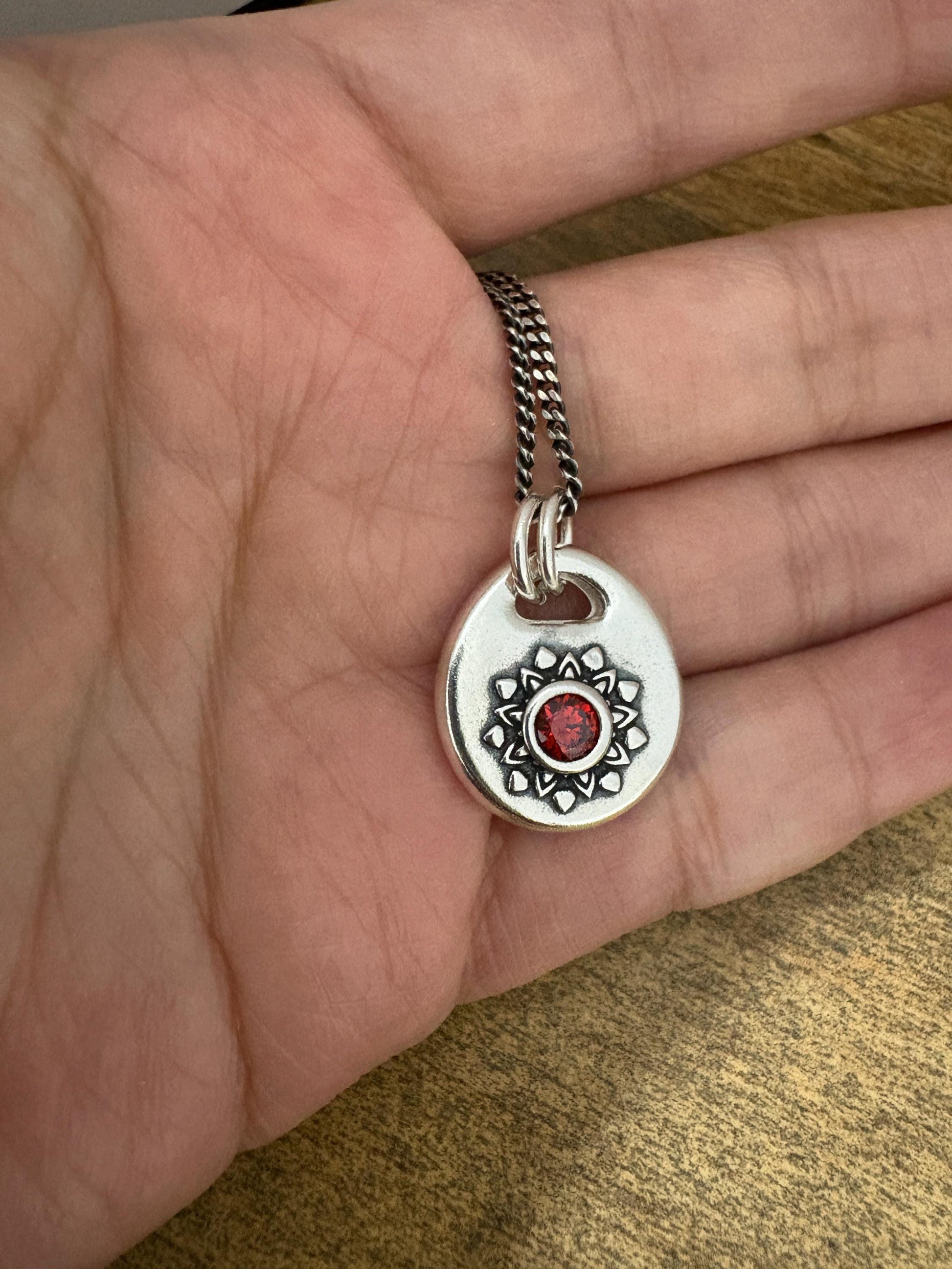 This one-of-a-kind handcrafted silver pendant features a radiant sunburst design surrounding a striking, deep red zircon at its center. Made with meticulous attention to detail, the textured silver contrasts elegantly with the bold red zircon, creating a piece that captures both elegance and energy. Perfect for adding a touch of artisan charm to any outfit, this pendant is versatile enough for everyday wear or special occasions.